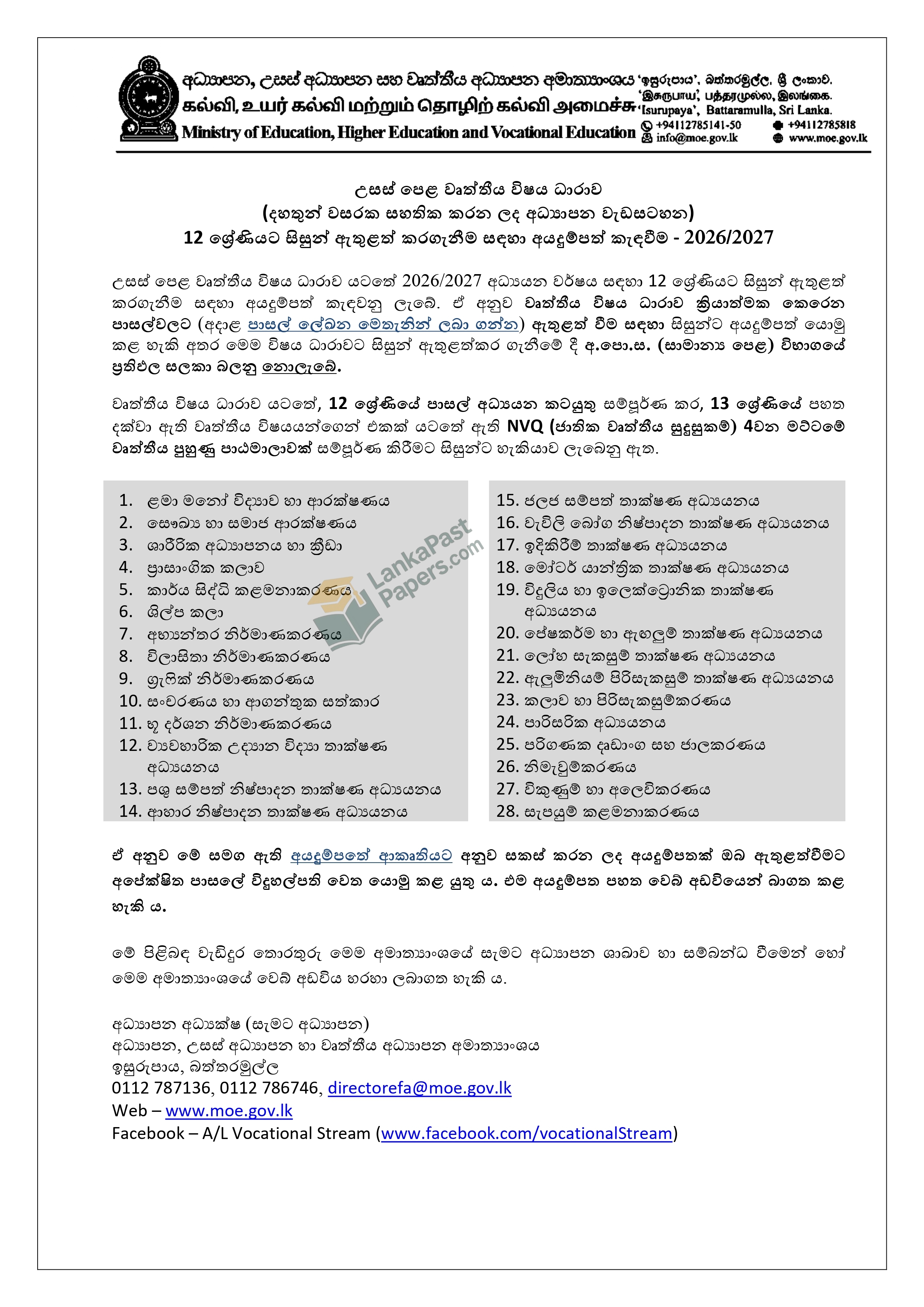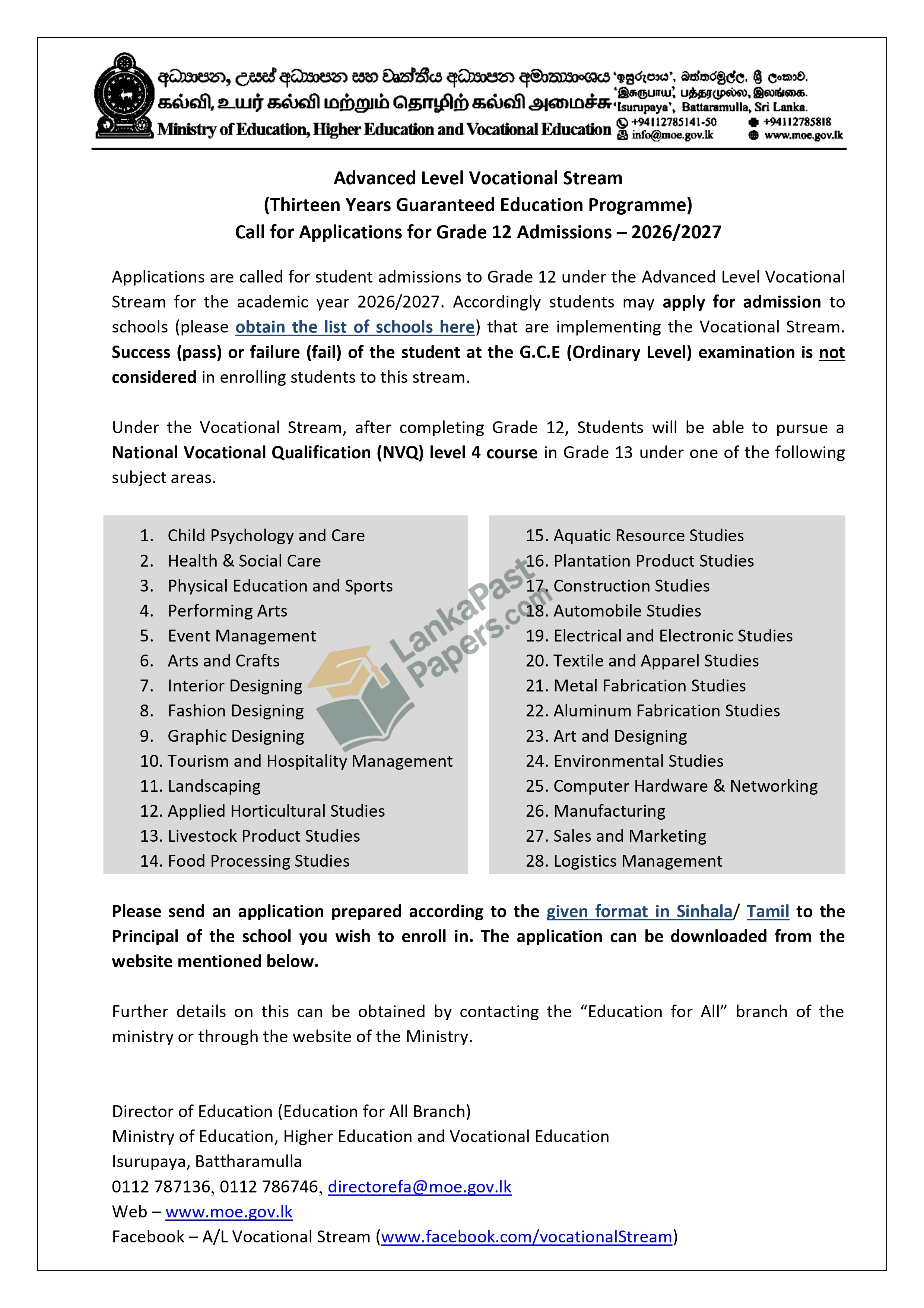 The Ministry of Education has called applications for admission to the G.C.E. Advanced Level Vocational Stream (Grade 12) under the Thirteen Years Guaranteed Education Programme for the academic year 2026 / 2027.