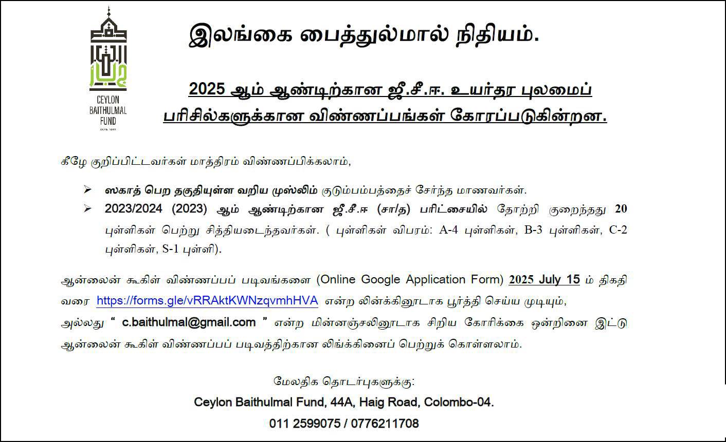 Applications are now open for the G.C.E. Advanced Level (A/L) Scholarship 2025 awarded by the Ceylon Baithulmal Fund (CBF), based on the O/L 2023 (2024) results. This is a golden opportunity for A/L students to receive financial support for their academic journey.
