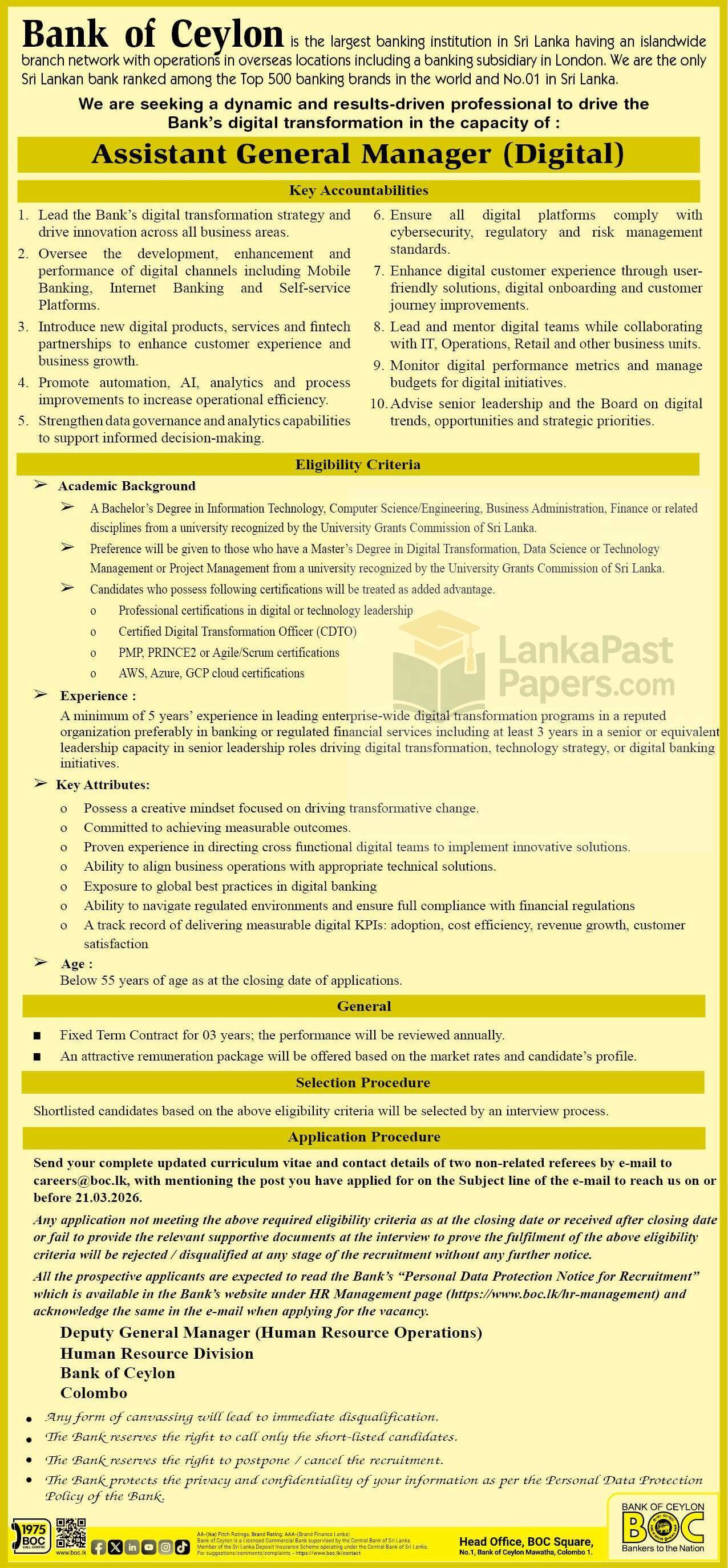 The Bank of Ceylon (BOC) has announced a new government job opportunity for the position of Assistant General Manager (Digital). Qualified professionals with experience in digital banking and technology leadership are invited to apply before the closing date.