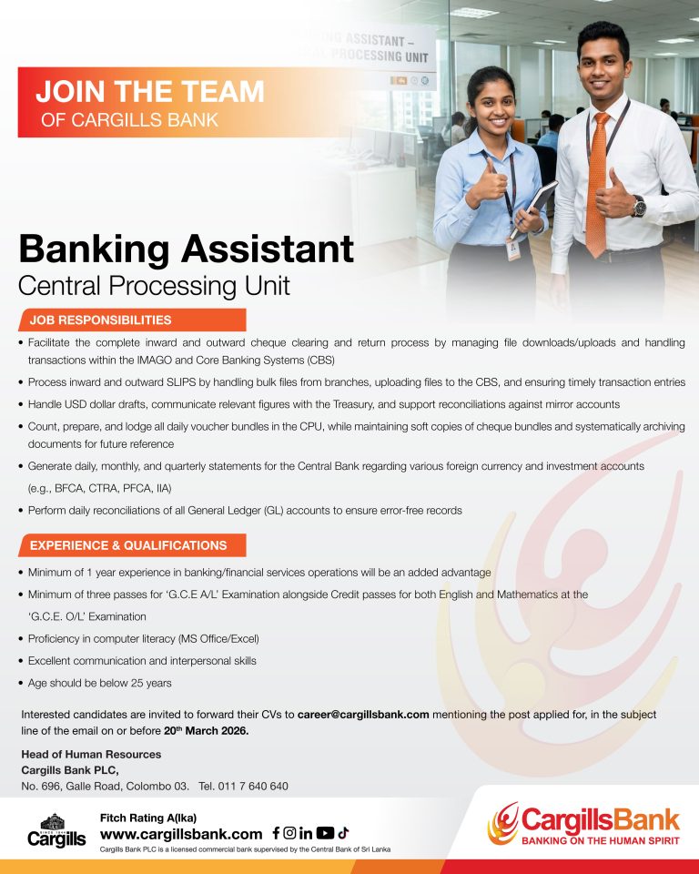 Cargills Bank PLC invites applications for the position of Banking Assistant – Central Processing Unit. This is a great opportunity for young candidates who want to start a career in the banking sector in Sri Lanka.