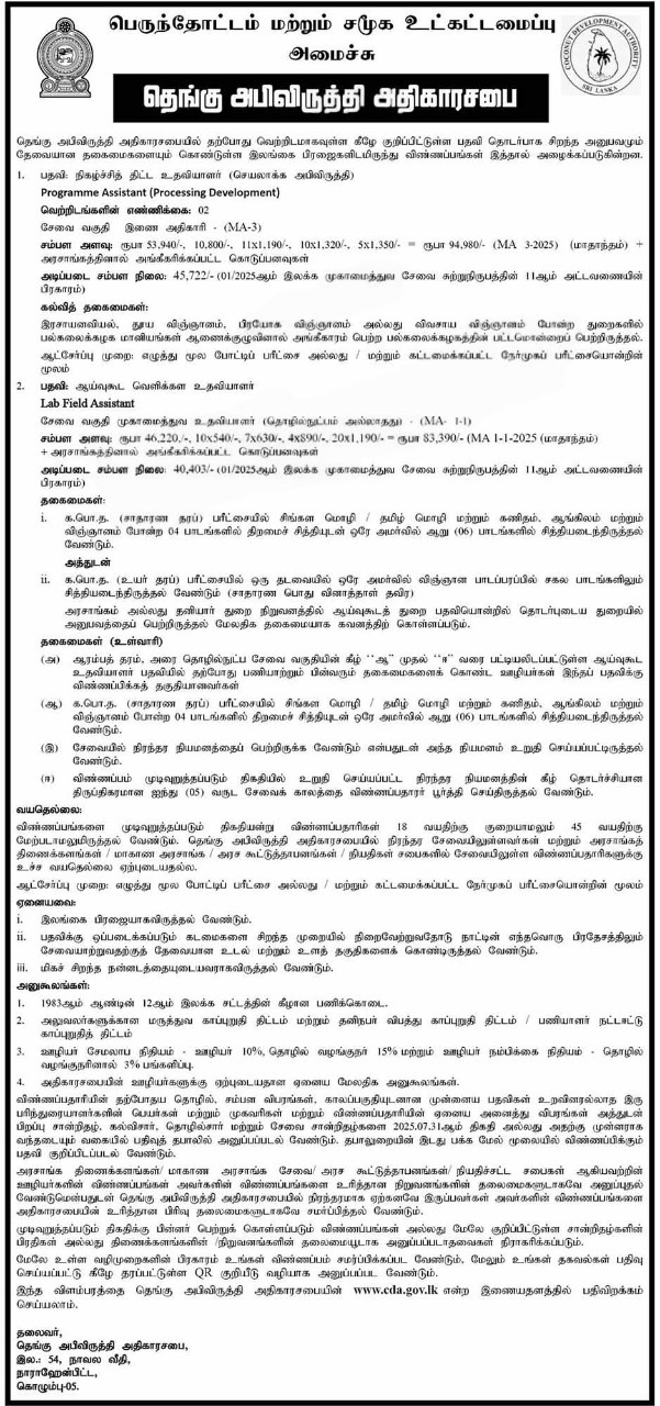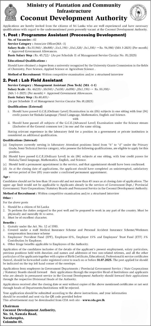 The Coconut Development Authority (CDA) under the Ministry of Plantation Industries is inviting applications for the following positions under Government Job Vacancies – July 2025.