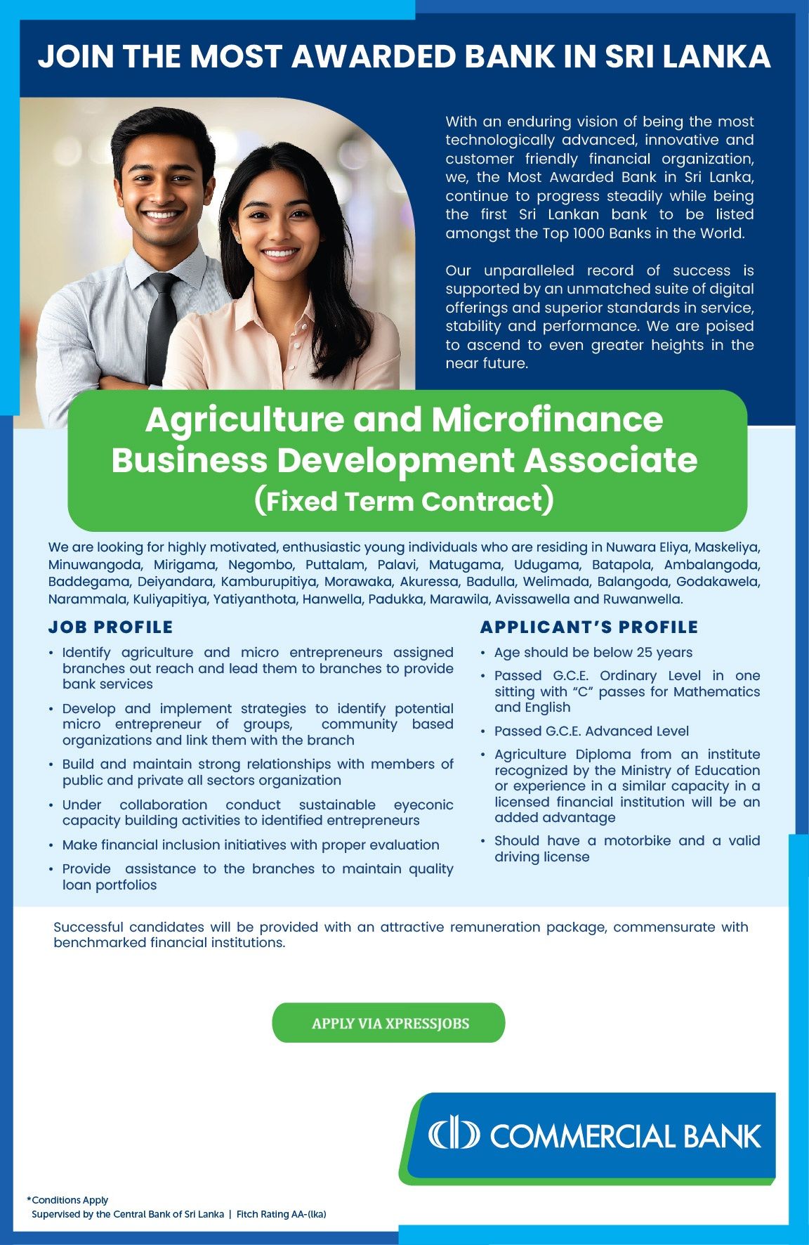 Commercial Bank of Ceylon PLC has announced new job vacancies for 2026, calling applications for the post of Agriculture & Microfinance Business Development Associates. This opportunity is ideal for young, energetic individuals who are interested in working in the banking sector while supporting agriculture and microfinance development across Sri Lanka. The positions are available on an islandwide basis and provide hands-on exposure to rural banking operations.