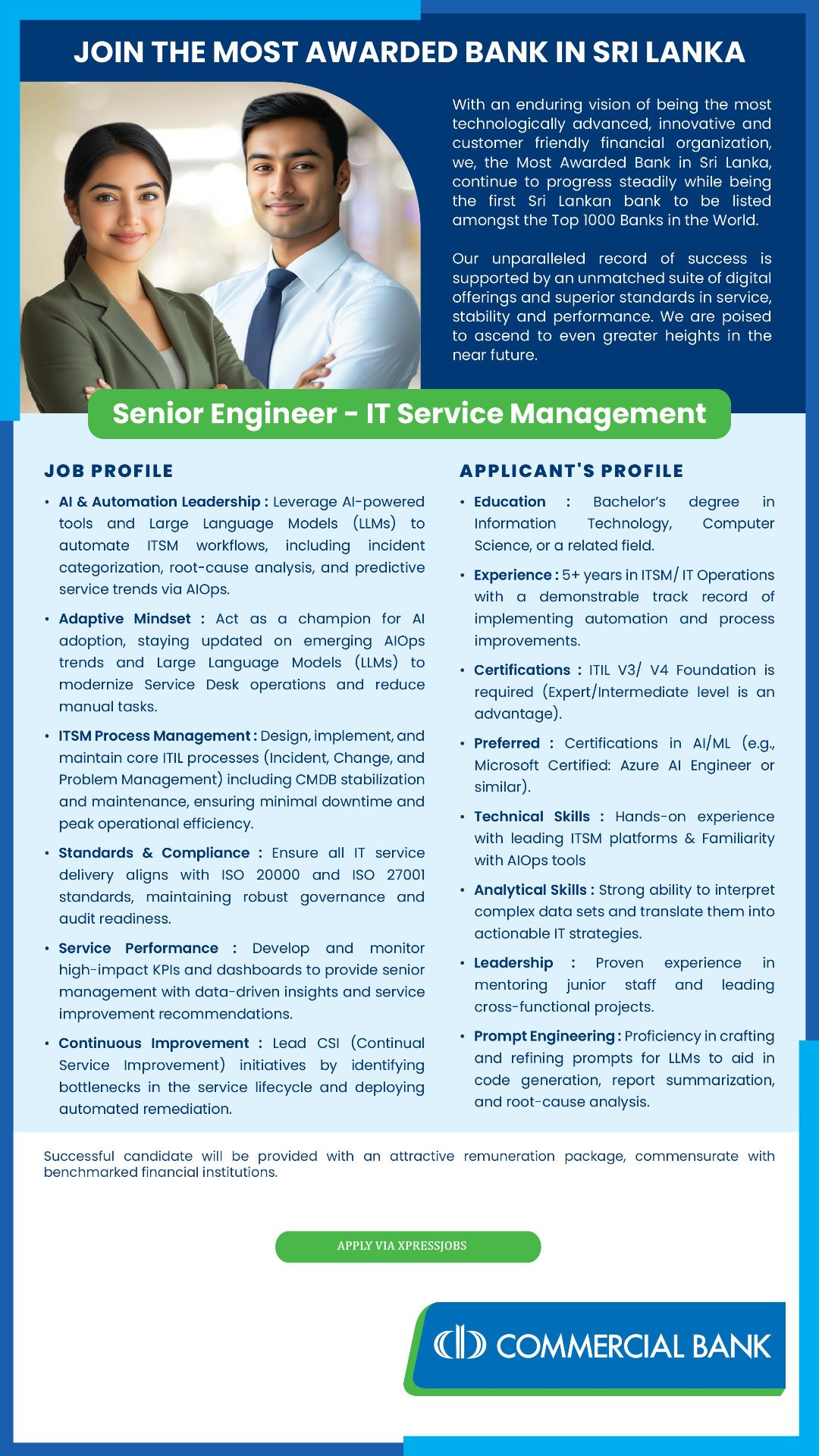 Keywords: Commercial Bank Job Vacancies 2026, Lead Engineer Database Jobs Sri Lanka, Senior Engineer IT Service Management Jobs, Banking Jobs Sri Lanka, Private Bank Jobs 2026