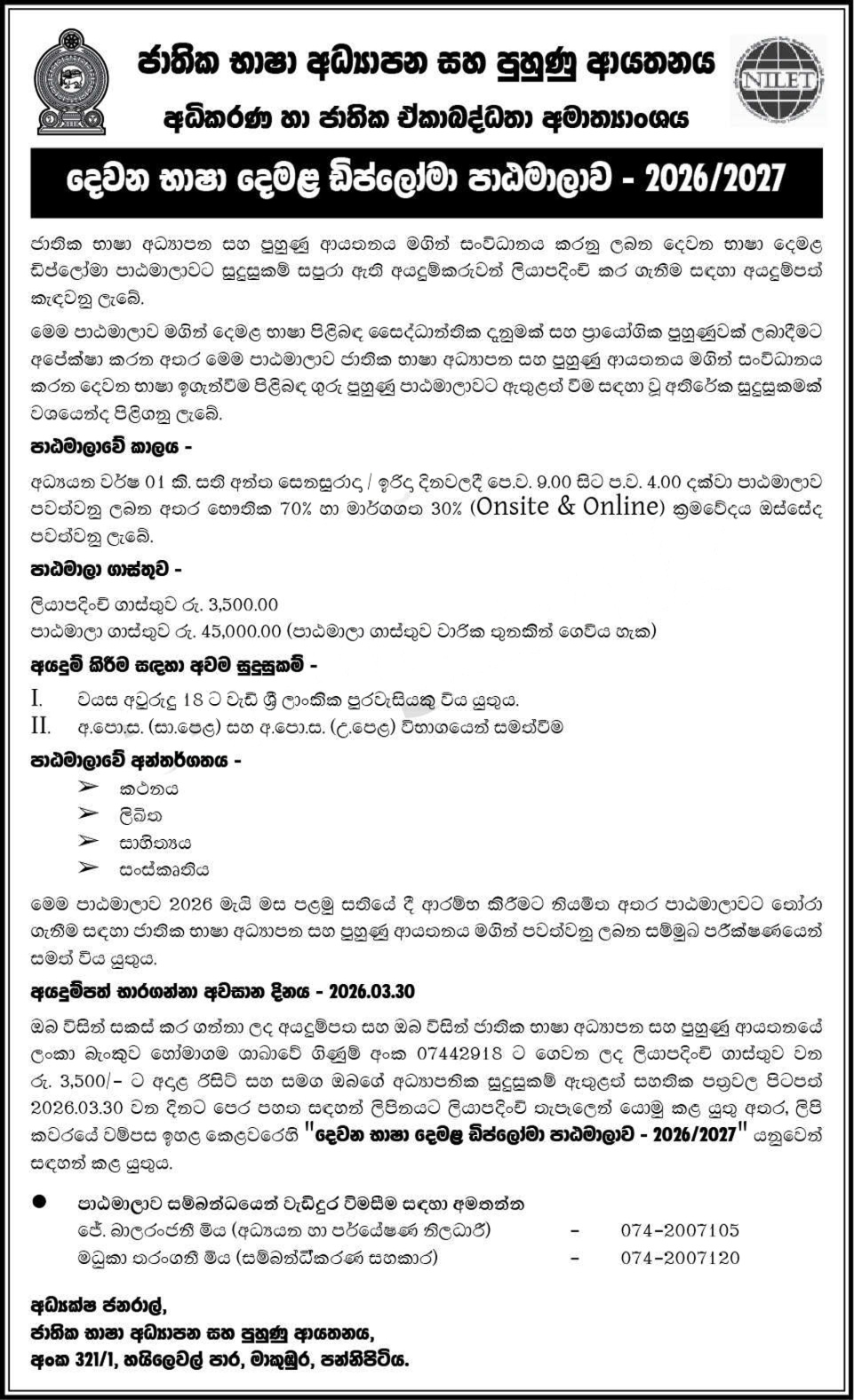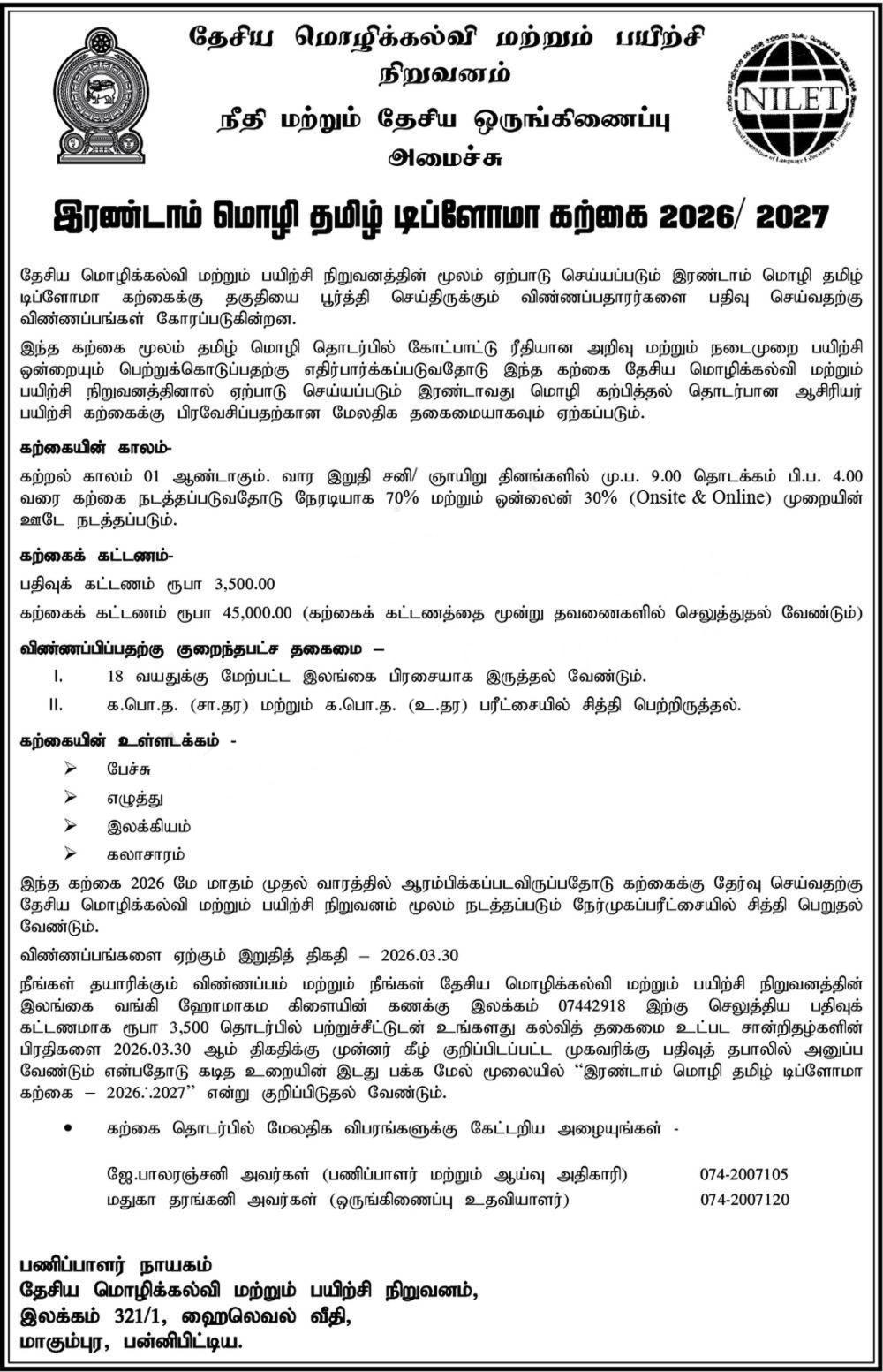 The National Institute of Language Education & Training (NILET), under the Ministry of Justice and National Integration, invites applications for the Diploma in Second Language Tamil – Academic Year 2026 / 2027. This nationally recognized qualification is suitable for the general public and candidates seeking professional advancement in Tamil language education.