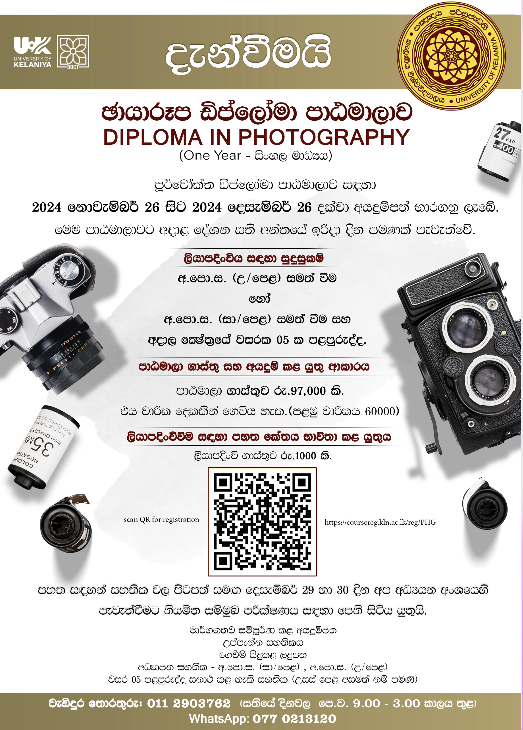 The University of Kelaniya invites applications for the Diploma in Photography 2026, conducted by the Drama, Cinema & Image Arts Unit (Department of Fine Arts). This 1-year diploma program provides comprehensive practical and theoretical training in photography, ideal for aspiring photographers, media professionals, and creative artists.