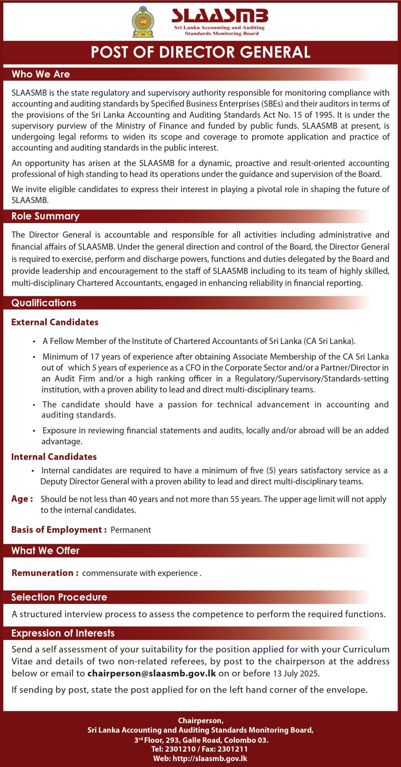Applications are invited for the post of Director General at the Sri Lanka Accounting and Auditing Standards Monitoring Board (SLAASMB). This leadership role is under the Ministry of Finance and is based in Colombo.