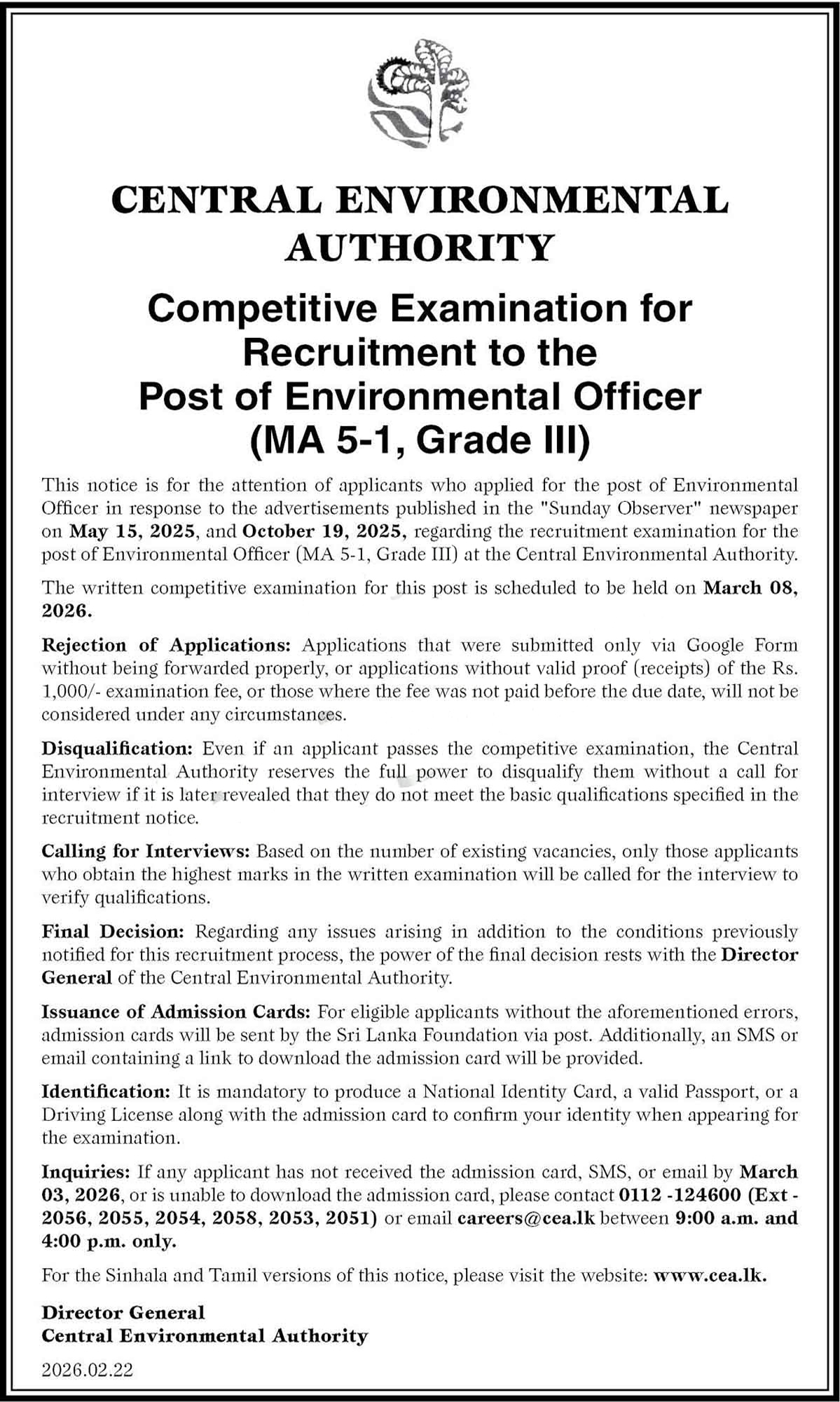 The Open Competitive Examination for Recruitment to the Post of Environmental Officer (MA 5-1, Grade III) conducted by the Central Environmental Authority (CEA) – Sri Lanka has officially announced the examination date and admission card details.