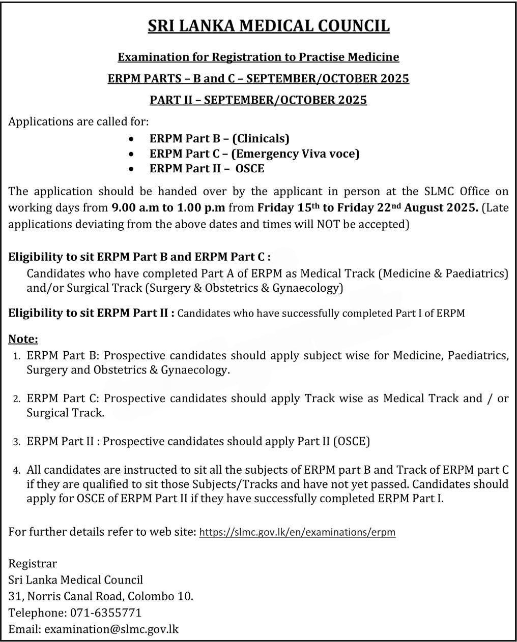 Calling Applications for the Examination for Registration to Practise Medicine (ERPM) – Part B & C / Part II (September / October 2025) conducted by the Sri Lanka Medical Council (SLMC).
