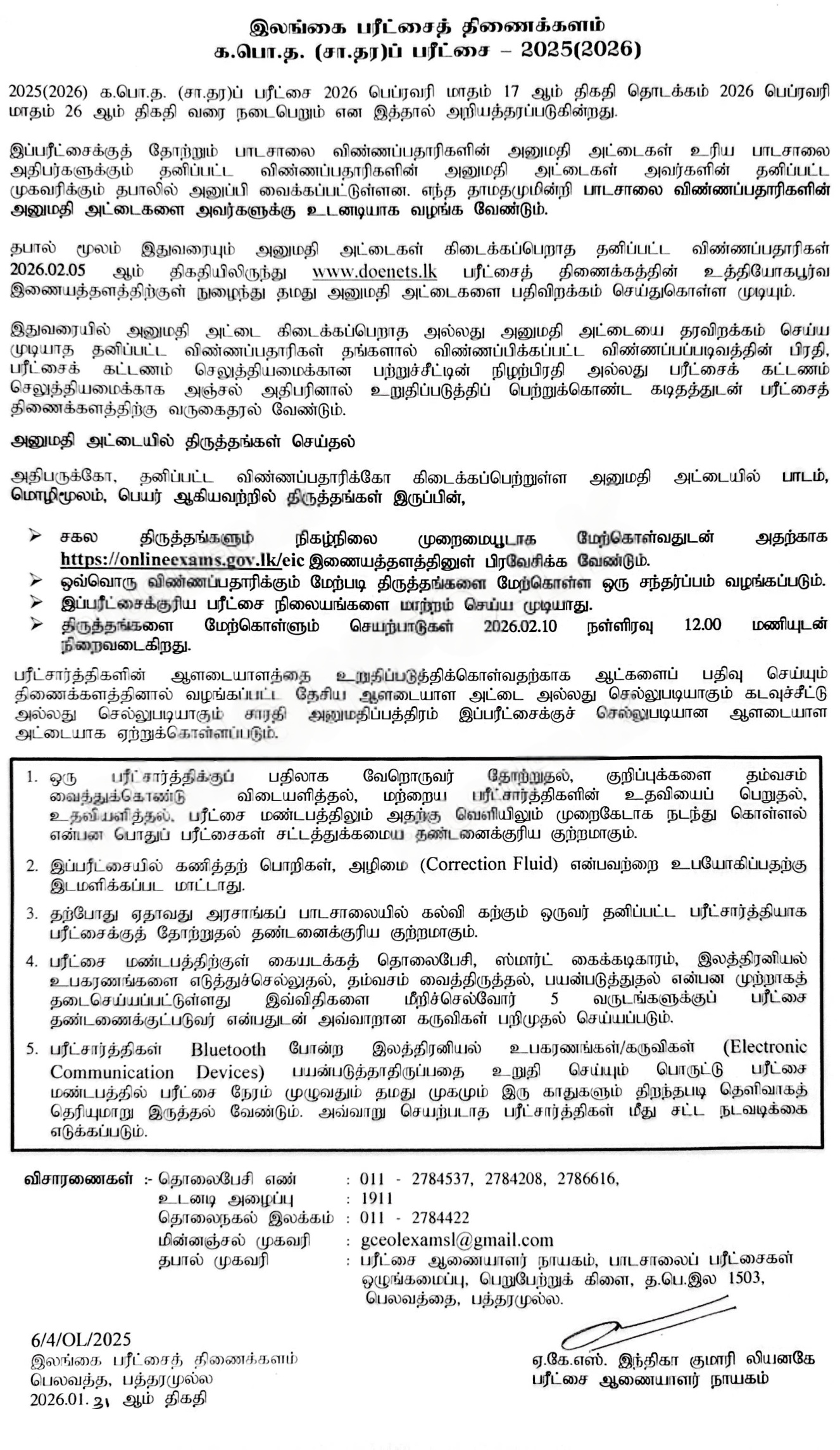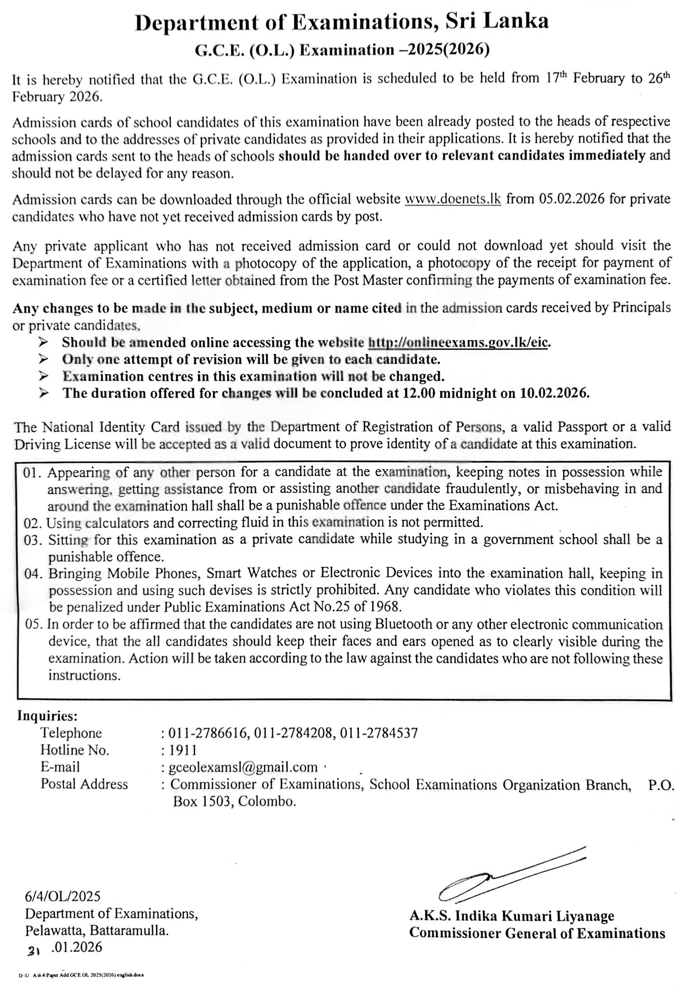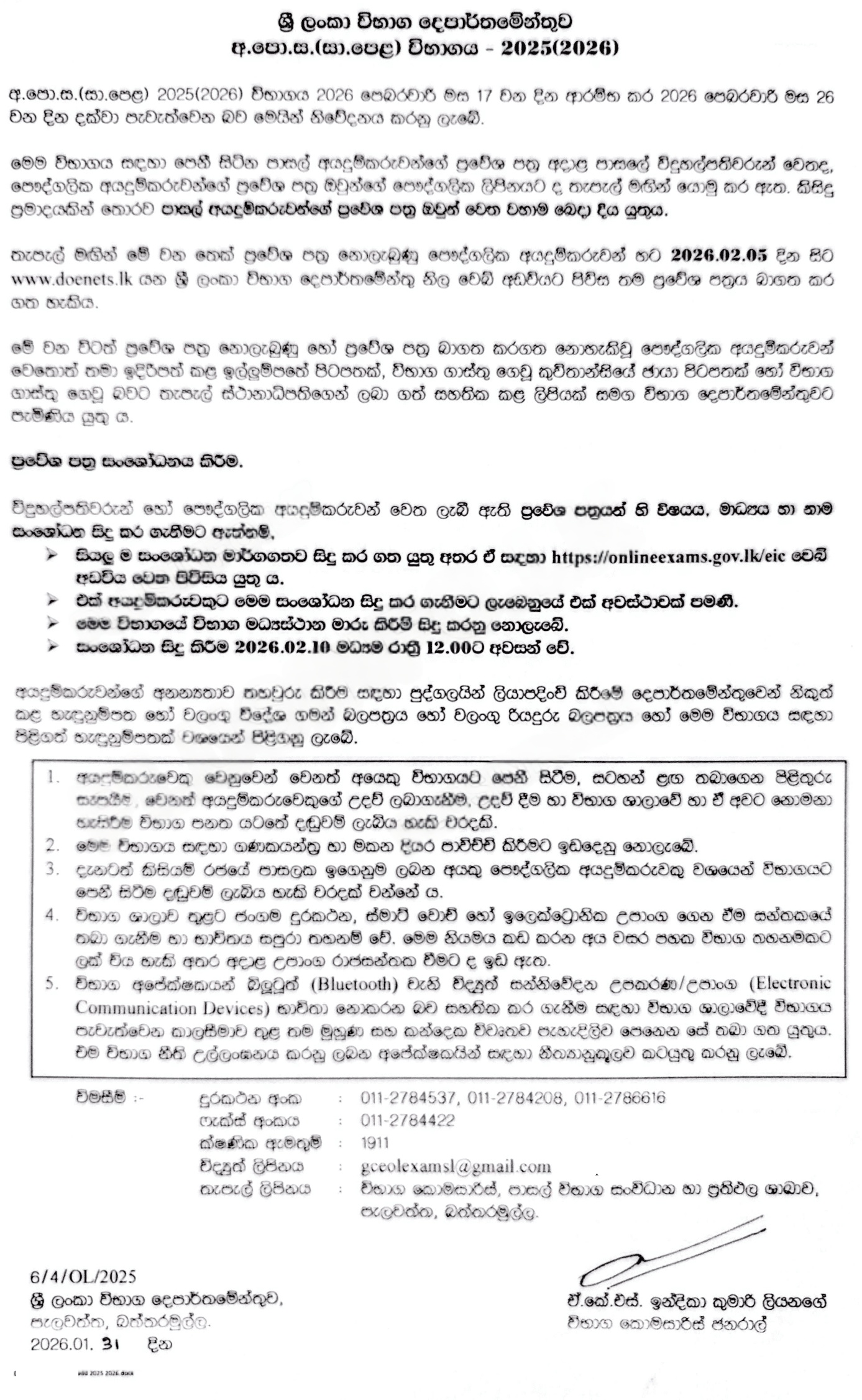 The Department of Examinations Sri Lanka has officially released an important notice regarding the issuance of Admission Cards and the procedure for making Amendments (Changes / Revisions) for candidates appearing for the GCE Ordinary Level (O/L) Examination 2025 (2026). All school and private candidates must carefully verify their personal details, subjects and examination center information. Any errors must be corrected before the closing date mentioned below.