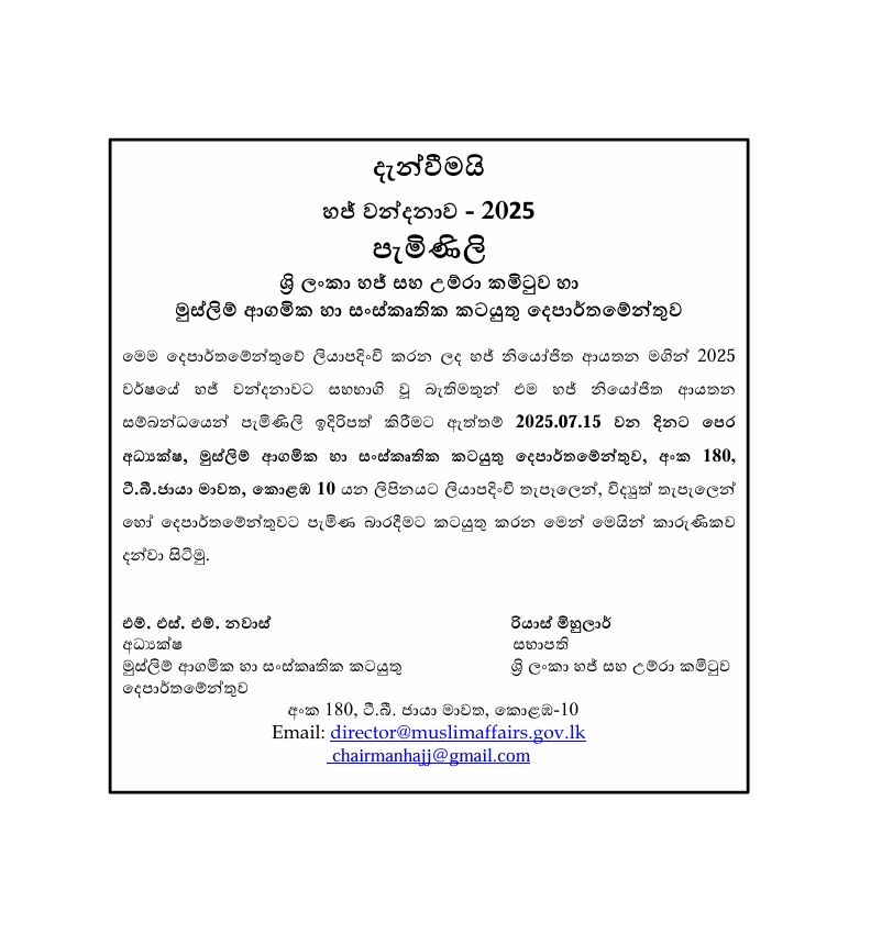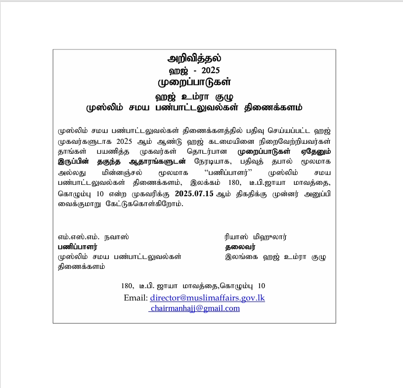 The Department of Muslim Religious and Cultural Affairs under the Ministry of Buddhasasana, Religious and Cultural Affairs has issued a notice inviting complaints related to the Hajj Pilgrimage 2025 (Hijri 1446).