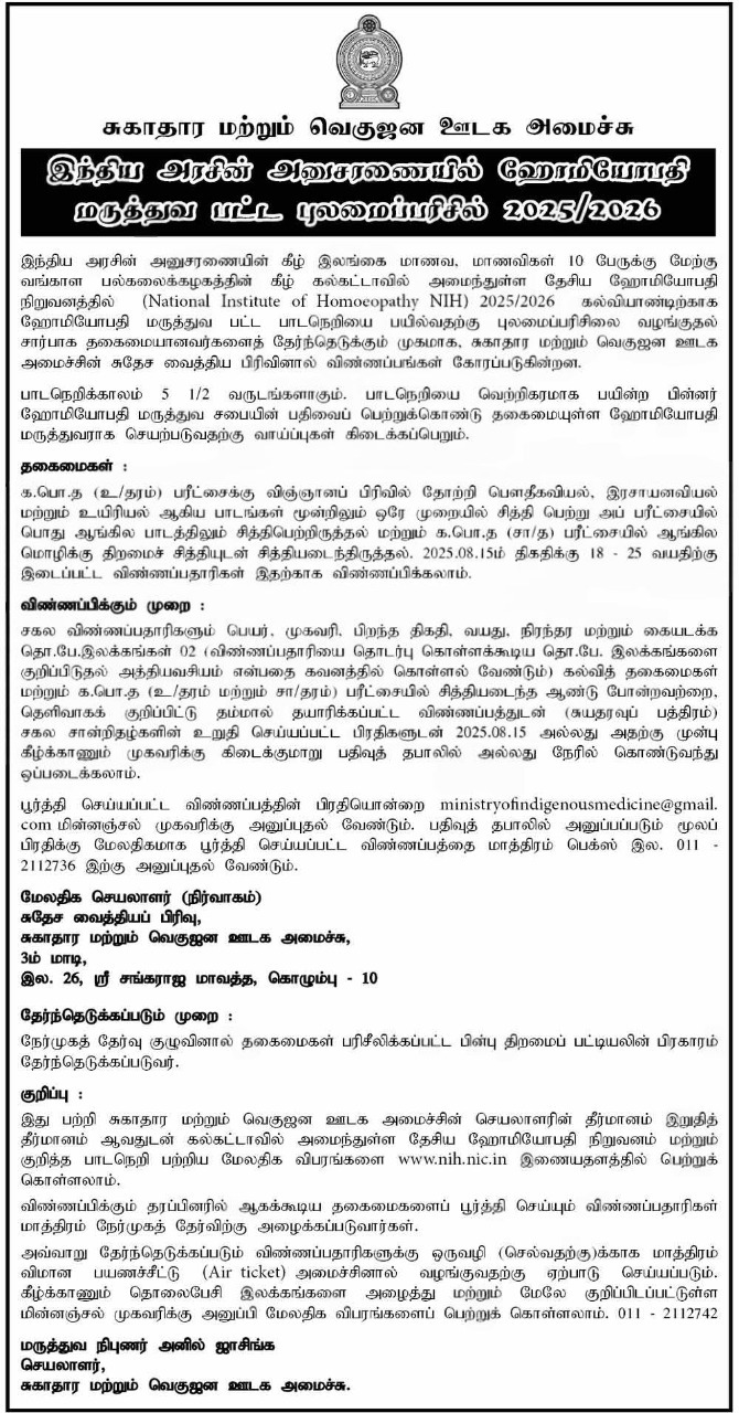 Applications are invited from eligible Sri Lankan students for the Homoeopathy Medical Degree Scholarships under the sponsorship of the Indian Government for the academic year 2025/2026.