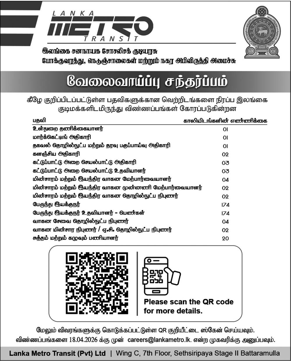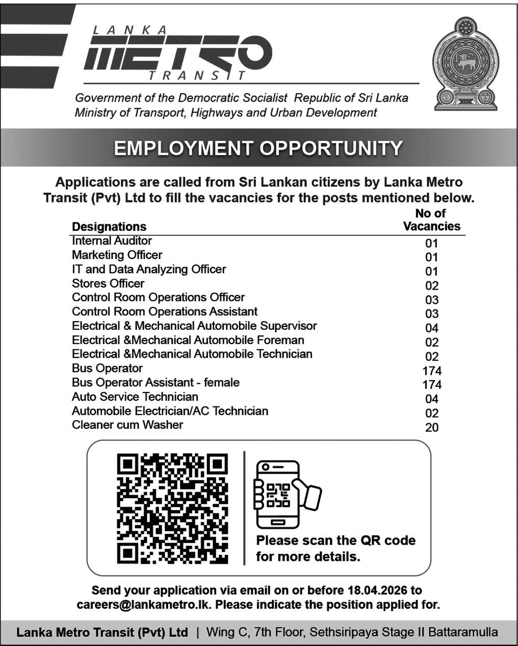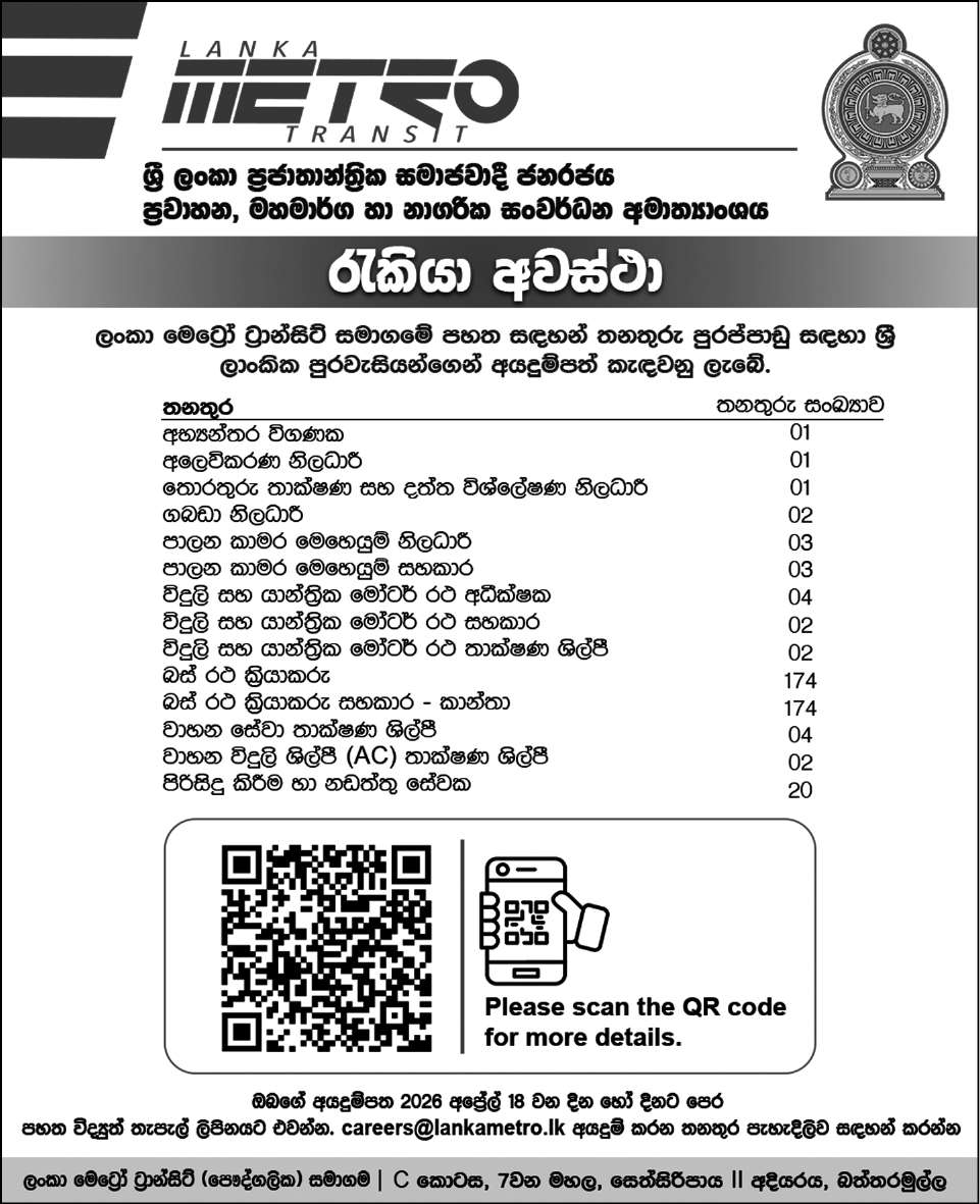 Applications are invited from Sri Lankan citizens for multiple vacancies at Lanka Metro Transit (Pvt) Ltd under the Ministry of Transport, Highways & Urban Development.