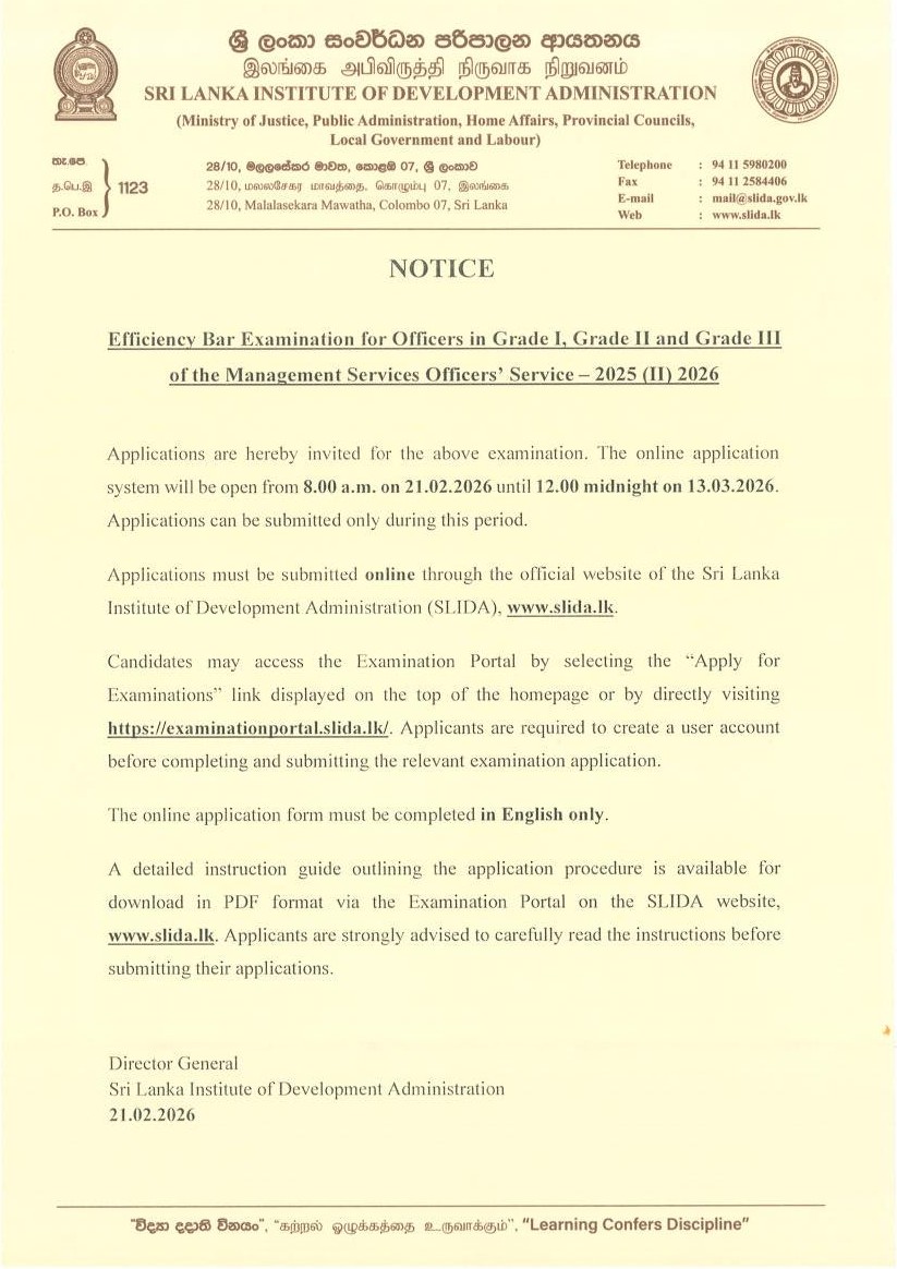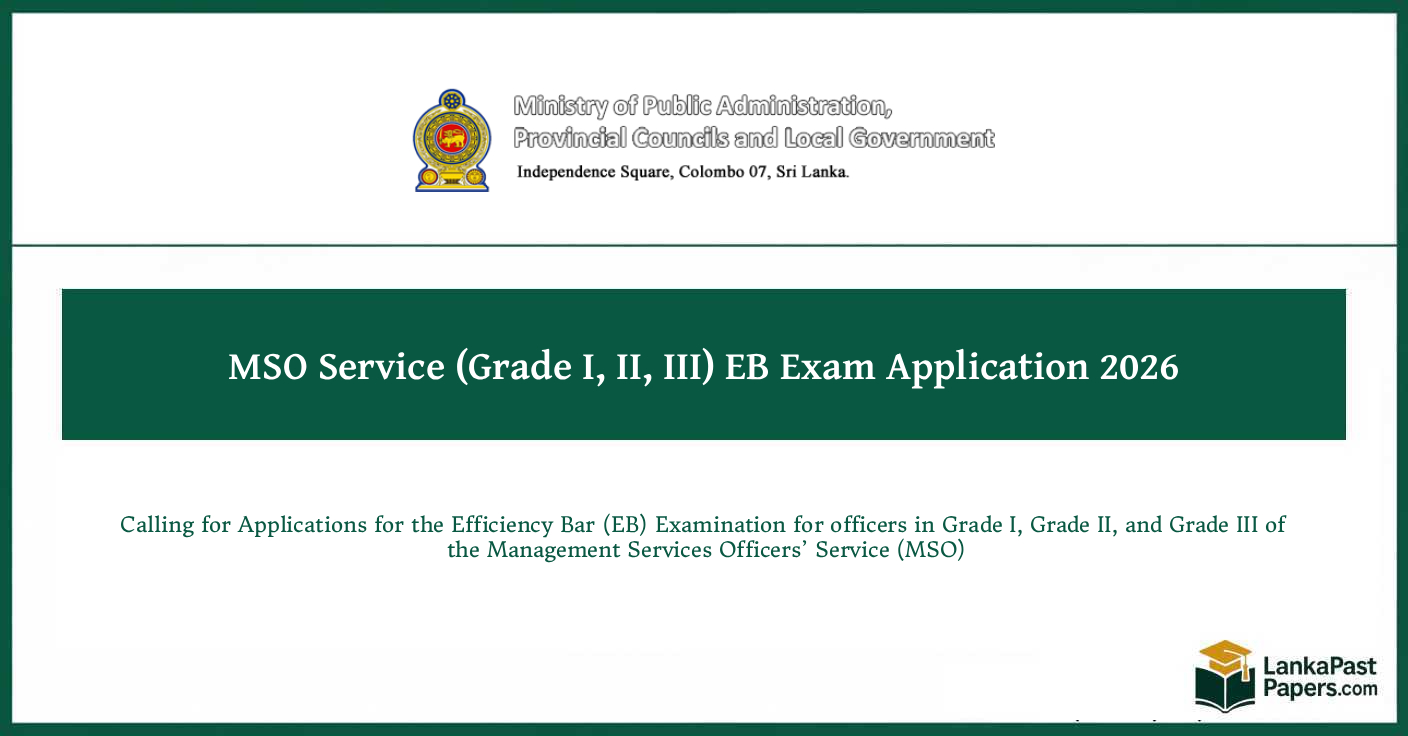 Calling for Applications for the Efficiency Bar (EB) Examination for officers in Grade I, Grade II, and Grade III of the Management Services Officers’ Service (MSO). This competitive government examination is conducted by the Sri Lanka Institute of Development Administration (SLIDA) under the Ministry of Public Administration, Provincial Councils and Local Government.