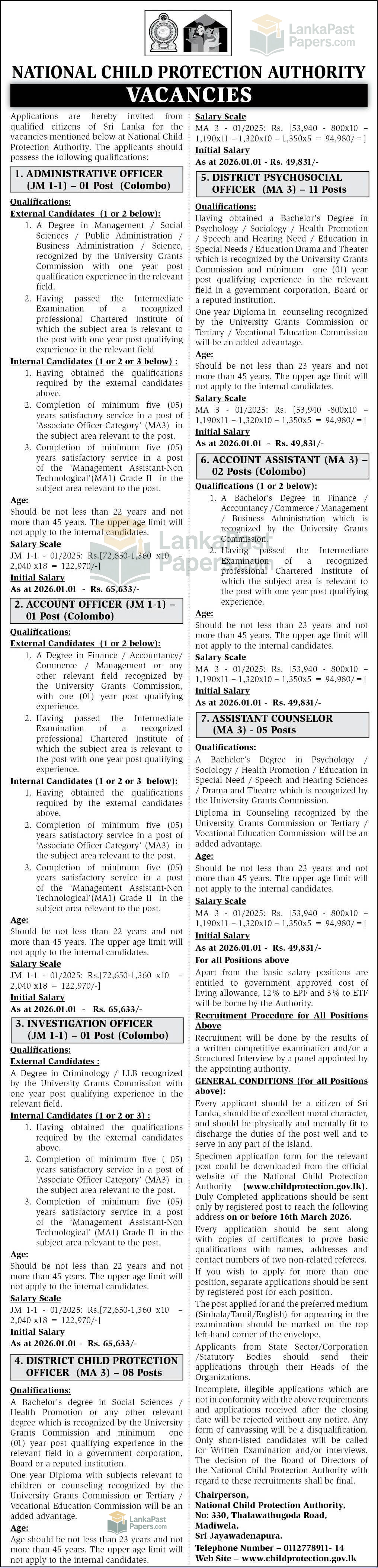 The National Child Protection Authority (NCPA) Sri Lanka has announced new government job vacancies for 2026. Qualified applicants are invited to apply for multiple positions including Administrative Officer, Account Officer, Investigating Officer, District Child Protection Officer, District Psychosocial Officer, Accountant Assistant and Assistant Counselor.