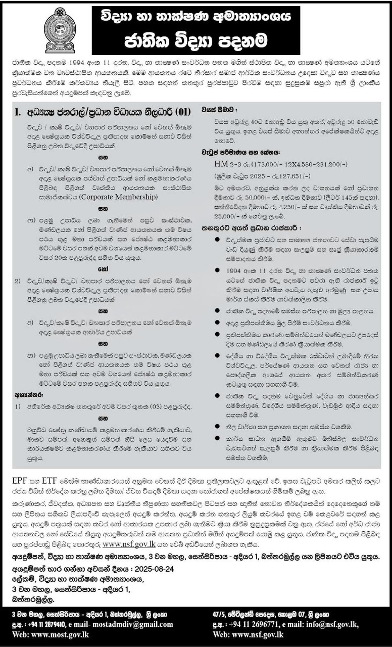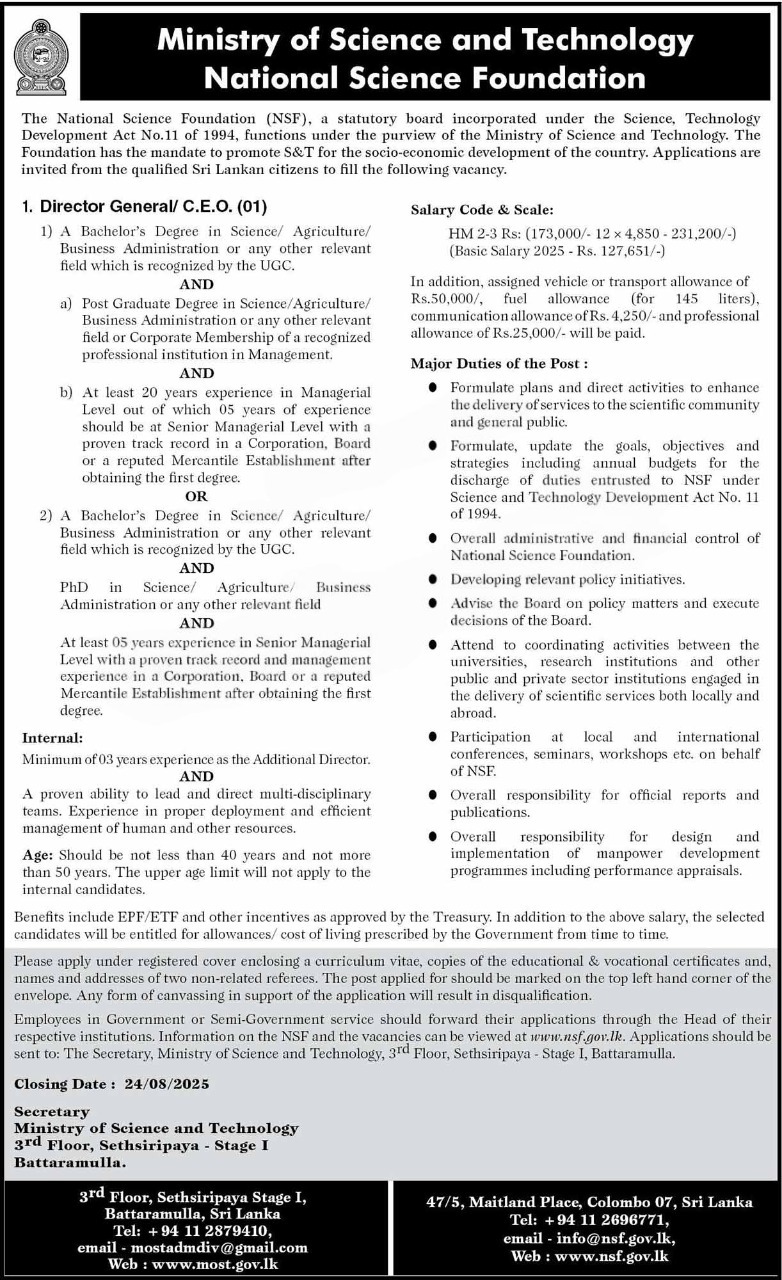 Applications are invited for the Post of Director General / Chief Executive Officer (C.E.O.) at the National Science Foundation (NSF) – August 2025.