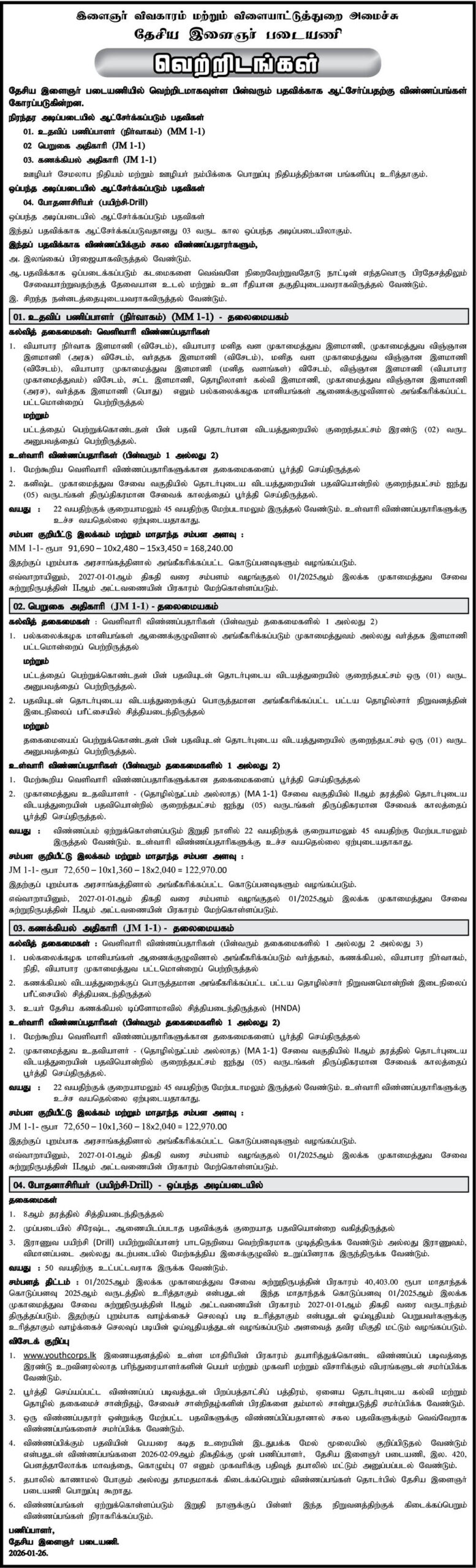 The National Youth Corps (NYC), Sri Lanka invites applications from suitably qualified candidates for the following government job vacancies in 2026.