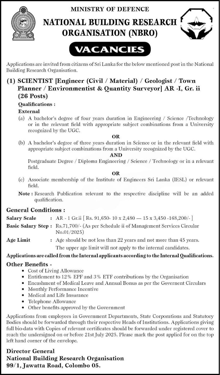 The National Building Research Organization (NBRO) invites applications for the post of Scientist under various disciplines. This is a valuable opportunity to join a leading government research agency.