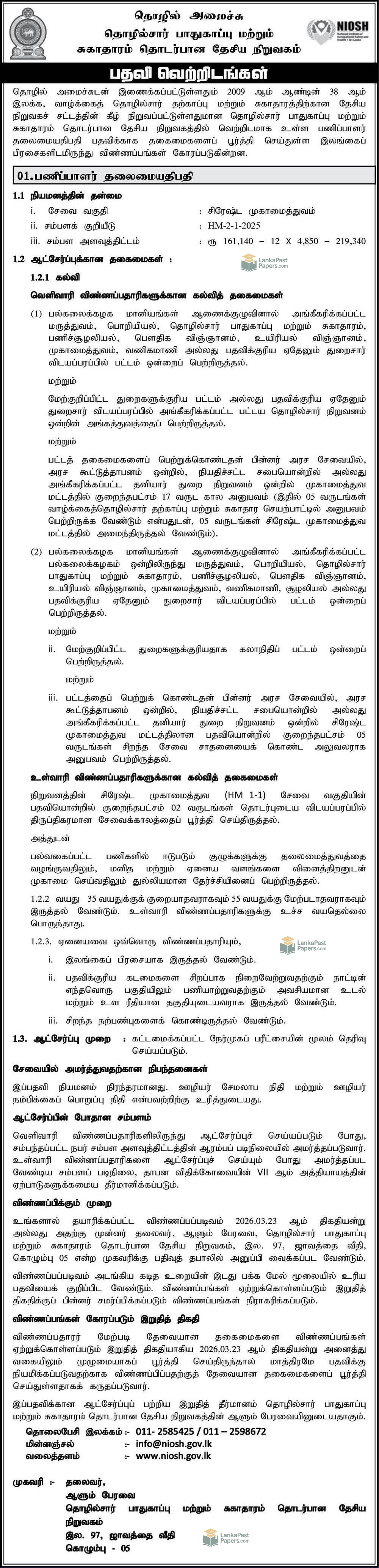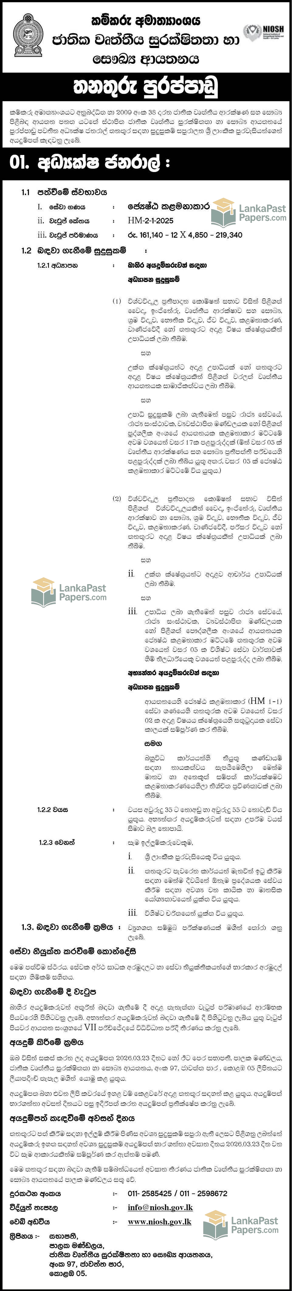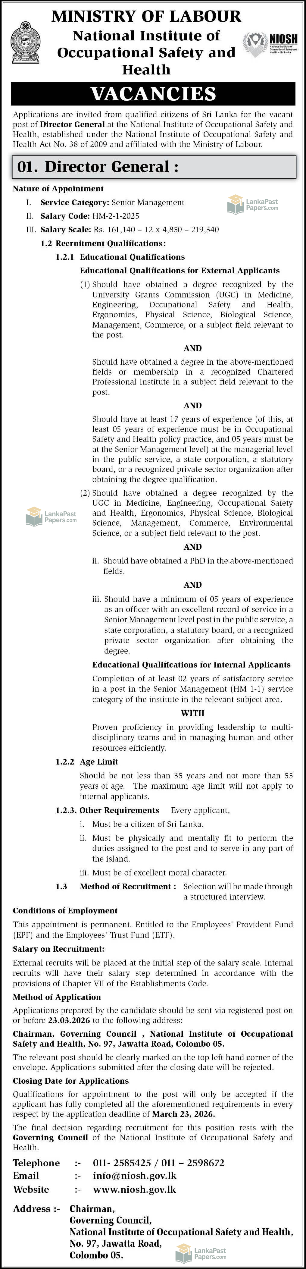 Applications are invited from qualified Sri Lankan citizens for the post of Director General at the National Institute of Occupational Safety and Health (NIOH), under the Ministry of Labour. This is a senior management government position with an attractive salary scale and permanent benefits.