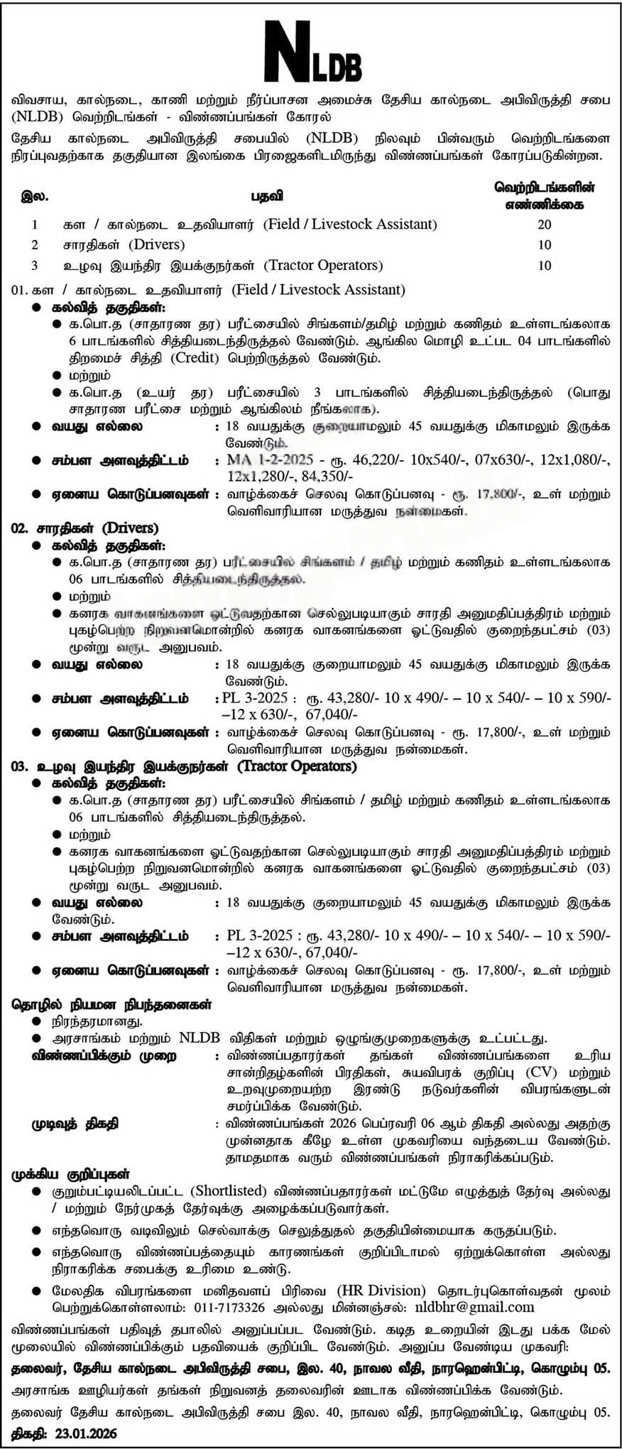 The National Livestock Development Board (NLDB) has announced new government job vacancies for 2026. Applications are invited from qualified Sri Lankan citizens for permanent posts under the Ministry of Agriculture, Livestock, Land and Irrigation.