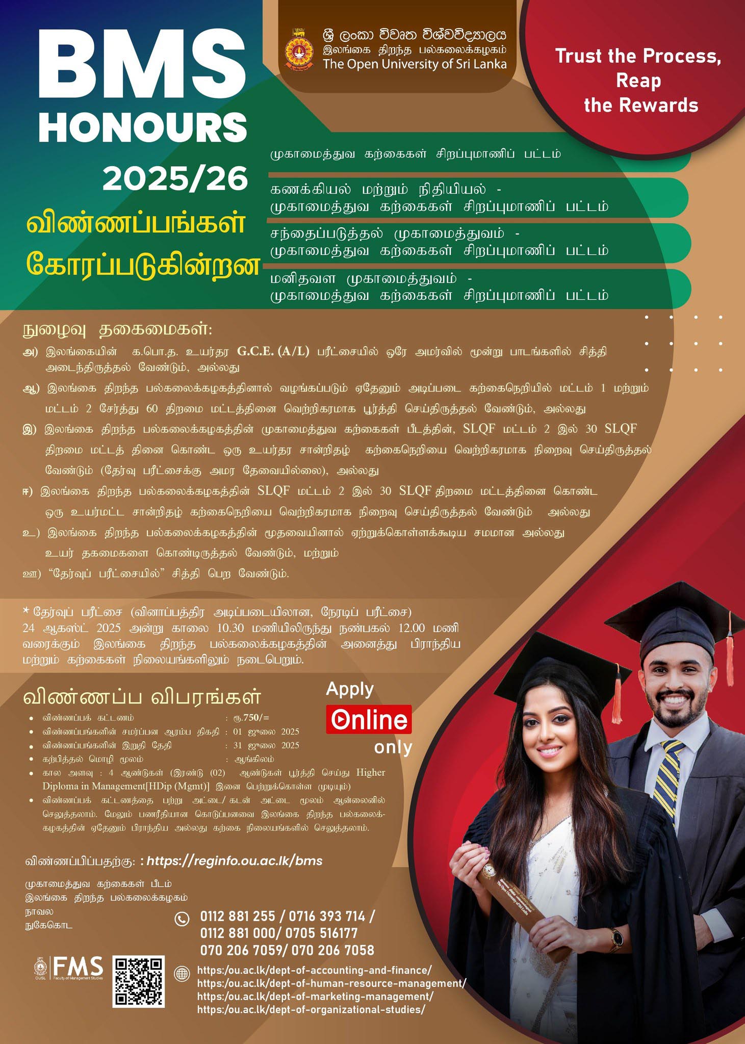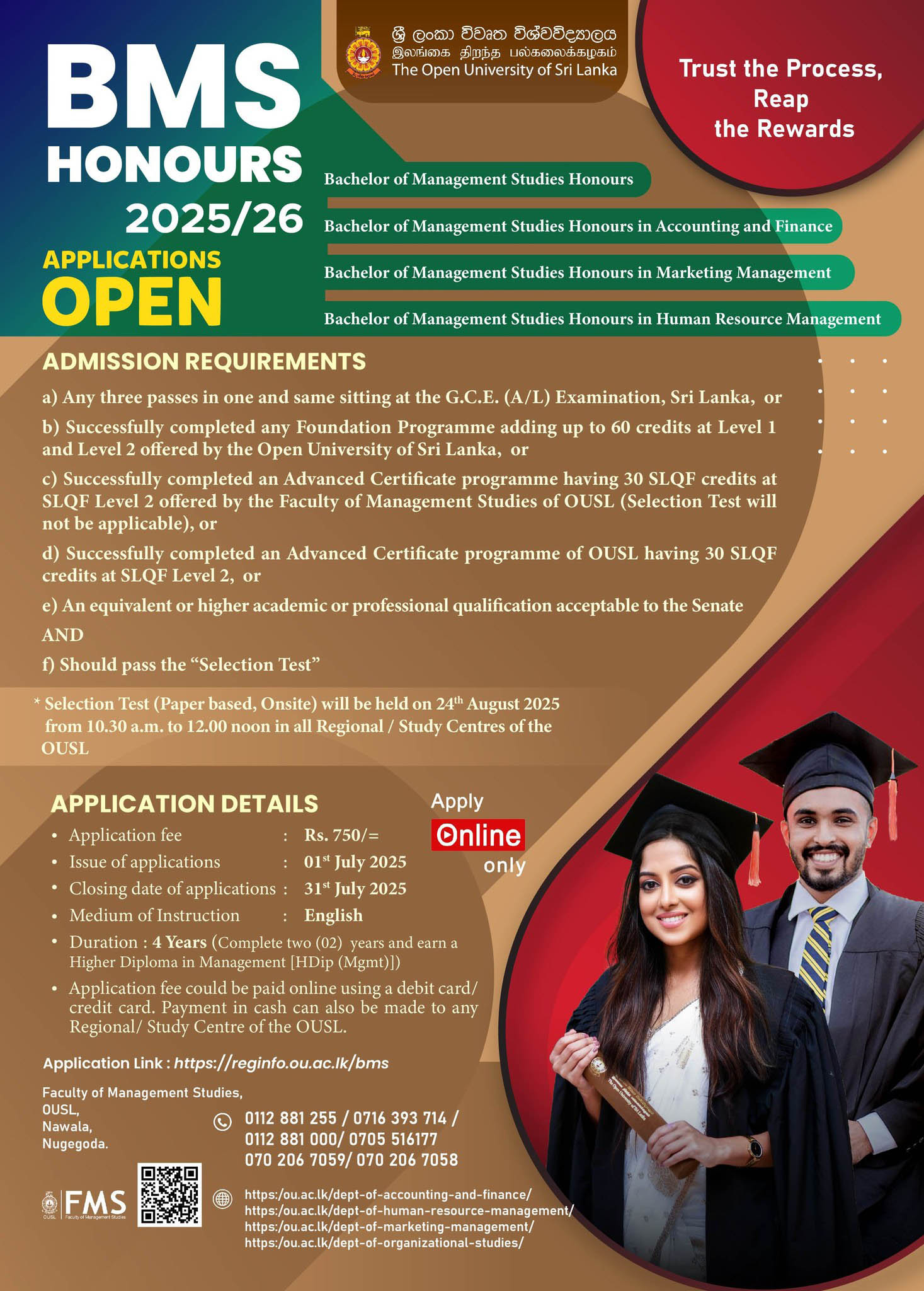 The Open University of Sri Lanka (OUSL) invites applications for the Bachelor of Management Studies (BMS) Honours Degree programmes for the 2025/2026 intake. The degree is delivered in English and is ideal for school leavers or professionals seeking careers in Management, Accounting, HR, or Marketing.