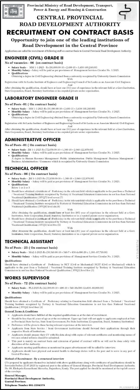 📝 Applications are invited for the following positions under the Central Provincial Road Development Authority. Qualified candidates should submit their applications before the deadline.