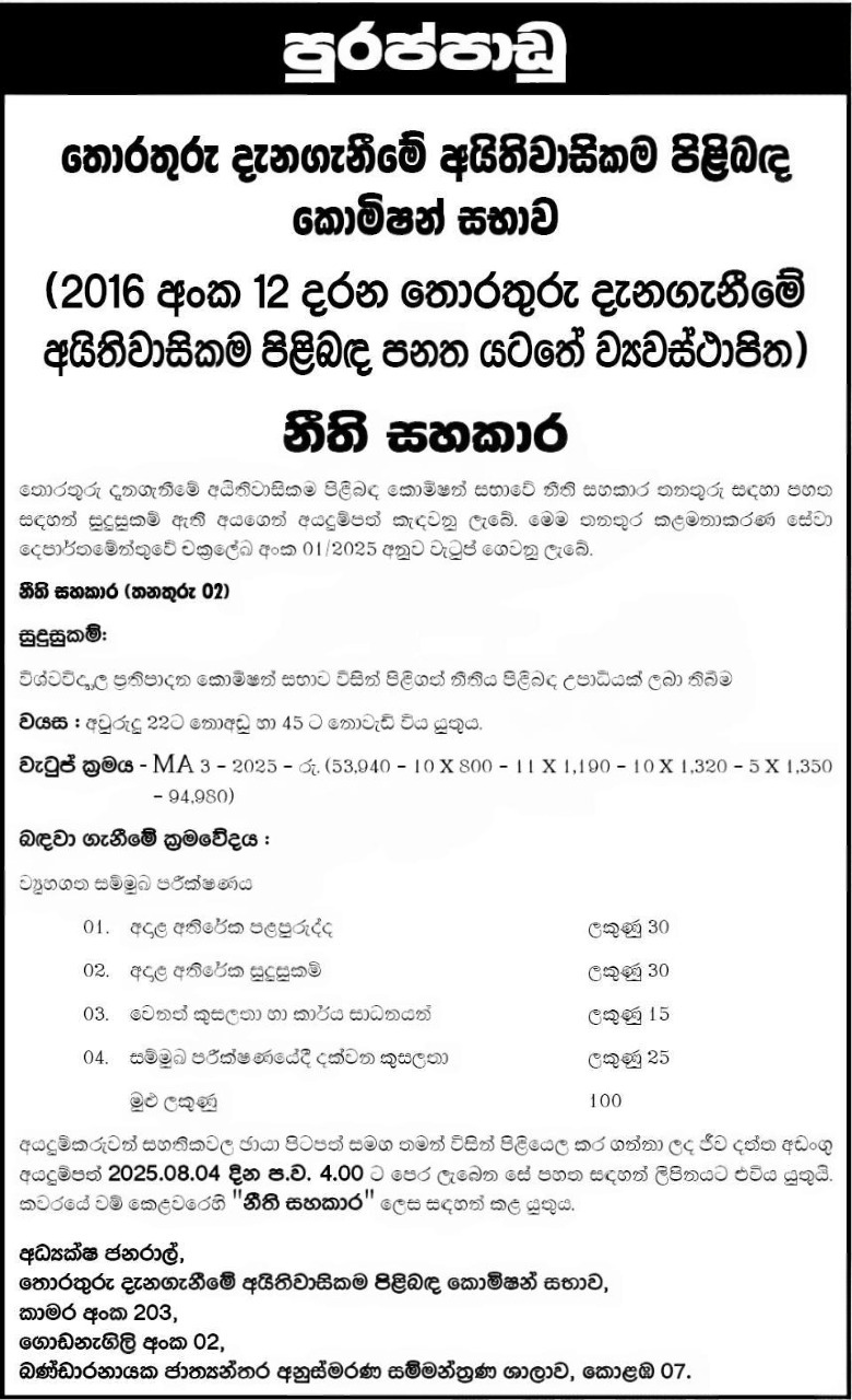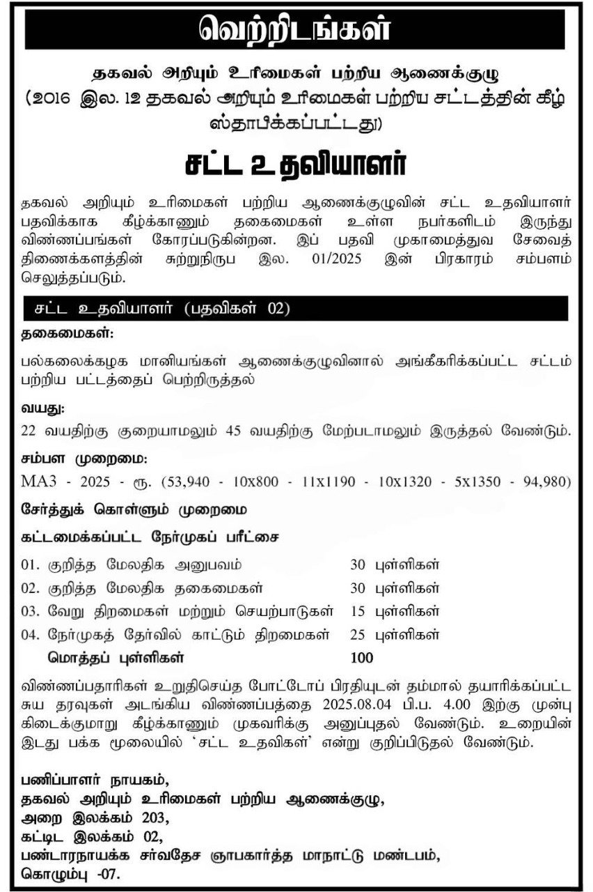 Applications are invited for the post of Legal Assistant at the Right to Information Commission (RTIC), Sri Lanka for the year 2025.