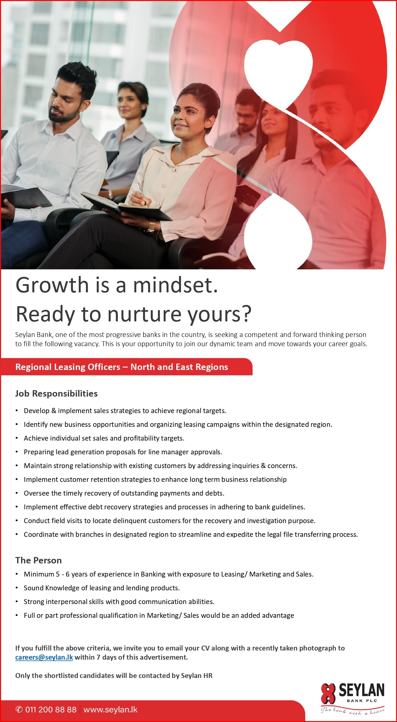 Seylan Bank PLC, one of Sri Lanka’s most progressive private banks, invites applications for the role of Regional Leasing Officer for the North & East Regions. This is a prestigious opportunity for professionals with solid experience in leasing, sales, marketing and customer relationship management. The selected candidate will drive regional leasing targets, expand business, and ensure efficient collections while strengthening client engagement.