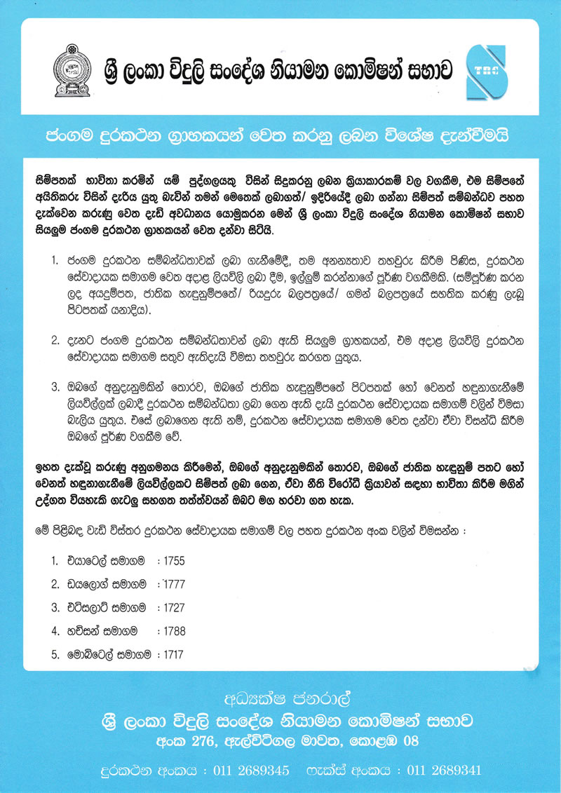 The Telecommunications Regulatory Commission of Sri Lanka (TRCSL) has issued a special warning regarding SIM card ownership and legal responsibility.