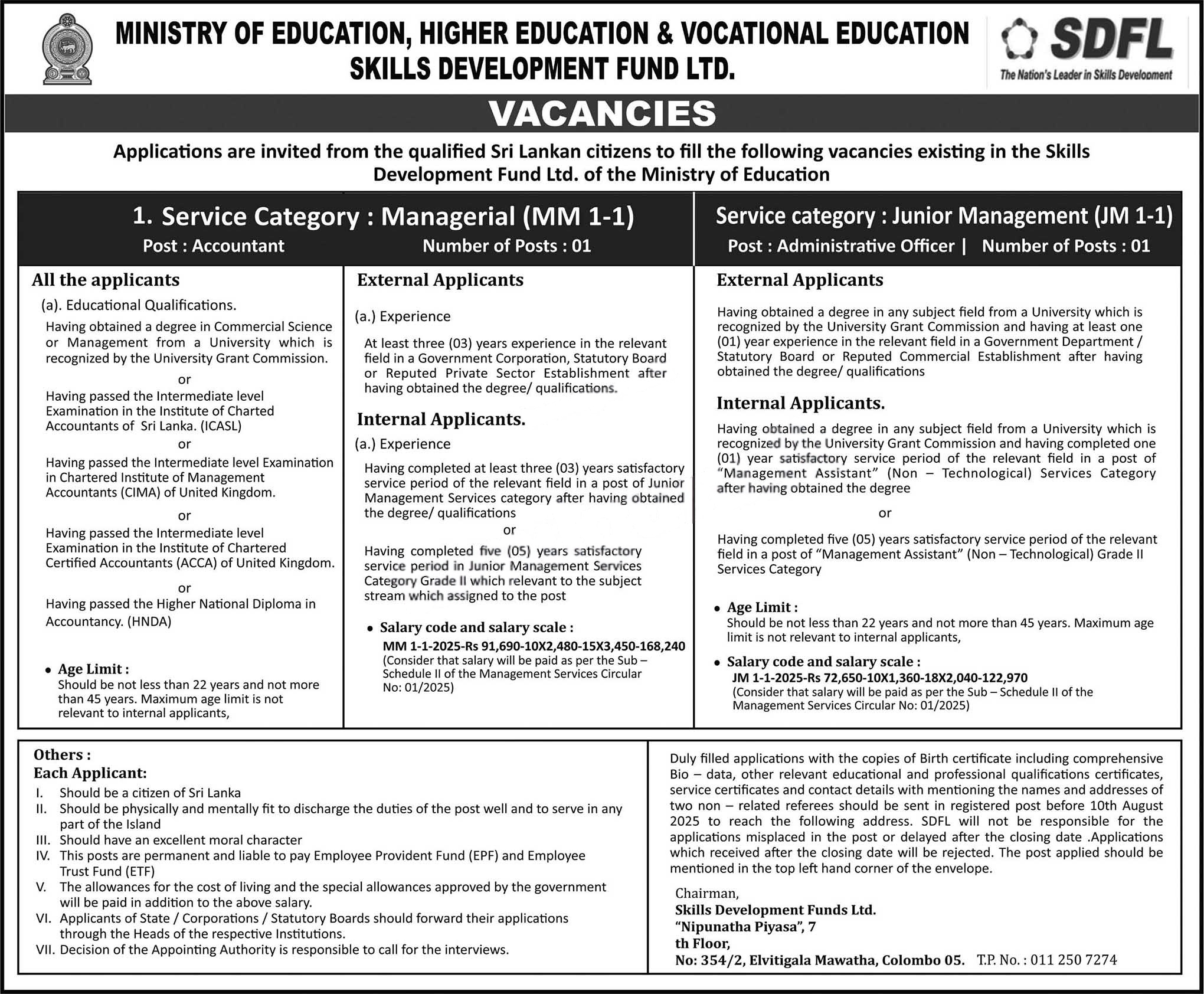 Applications are invited from qualified candidates for the following positions at the Skills Development Fund Ltd (SDFL). This is a great opportunity to join a reputed government institution and advance your career.