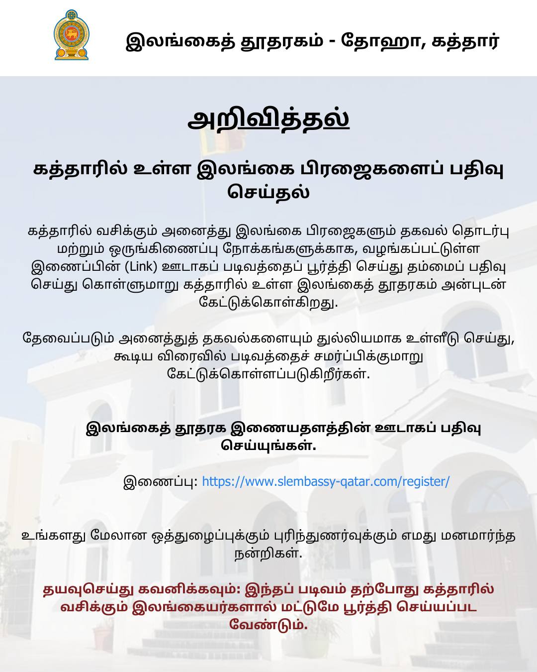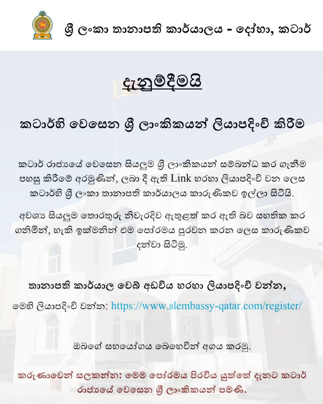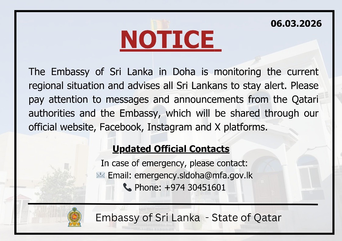 The Embassy of Sri Lanka in Doha has issued an important notice advising all Sri Lankan citizens currently living in Qatar to remain alert due to the present regional situation. The Embassy is closely monitoring developments and recommends Sri Lankans to follow official announcements issued by Qatari authorities and the Sri Lankan Embassy.