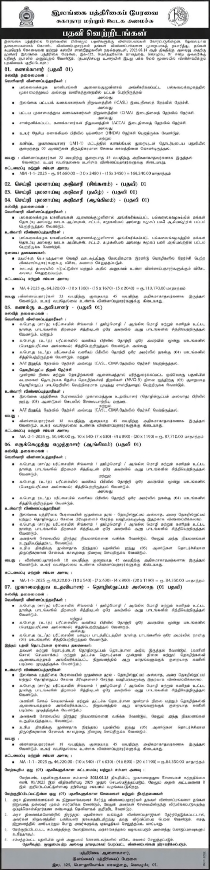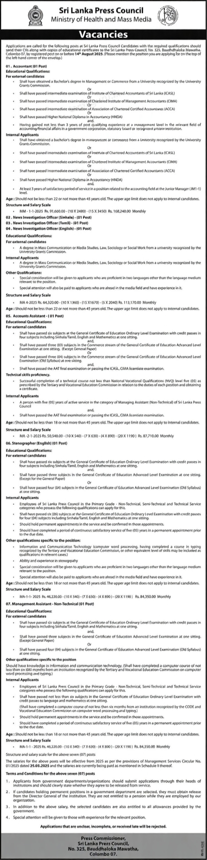 The Sri Lanka Press Council invites applications for the following job vacancies in August 2025: