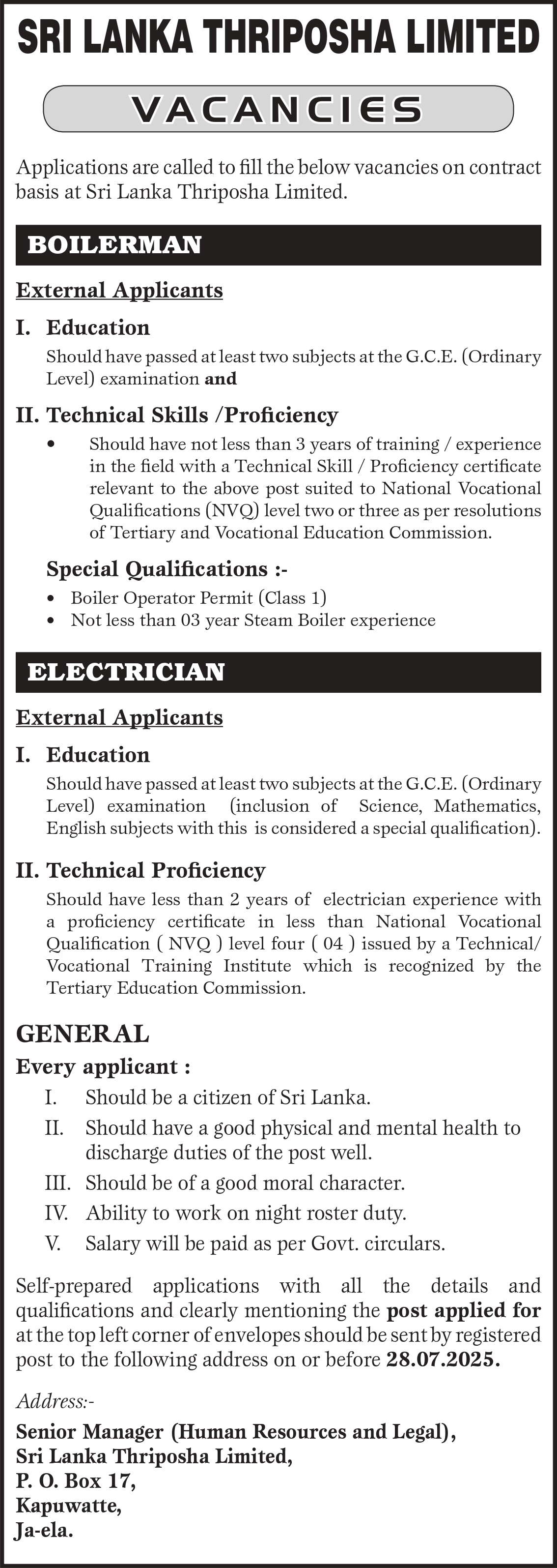 Applications are invited for the post of Boilerman at Sri Lanka Thriposha Limited. This is a valuable government job opportunity for candidates with technical qualifications and experience in boiler operations.