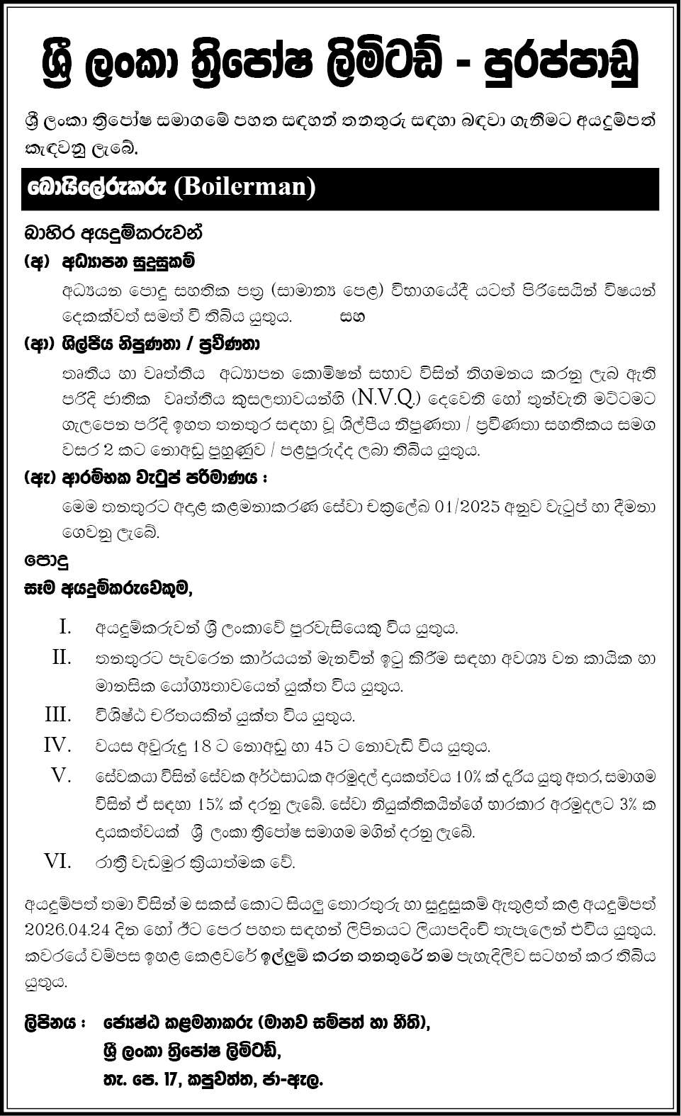 š Keywords: Sri Lanka Thriposha Jobs 2026, Boilerman Jobs Sri Lanka, Government Vacancies SL 2026