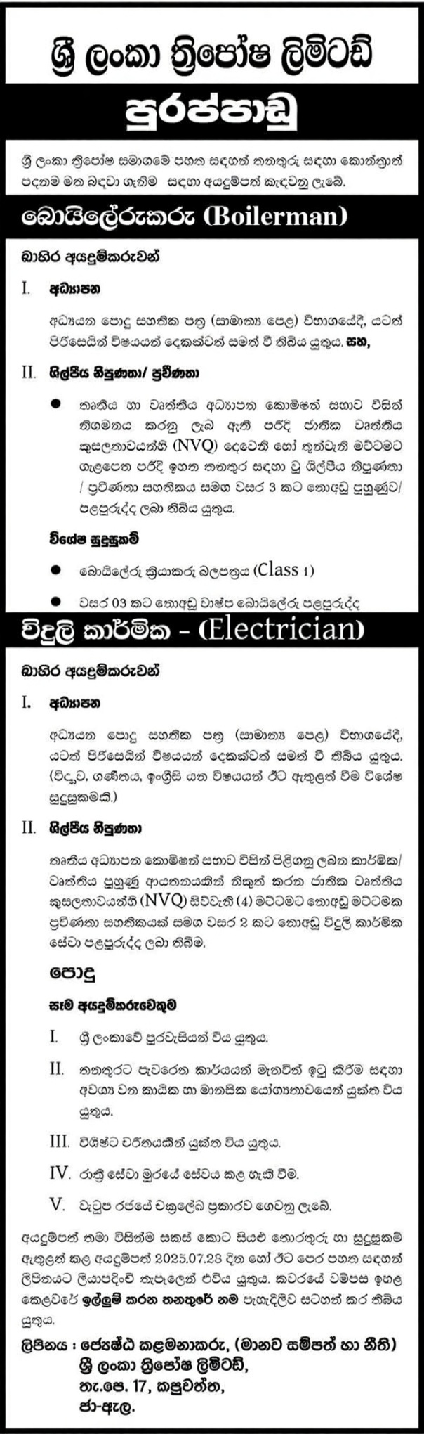 Applications are invited for the following job vacancies at Sri Lanka Thriposha Ltd for the month of July 2025.